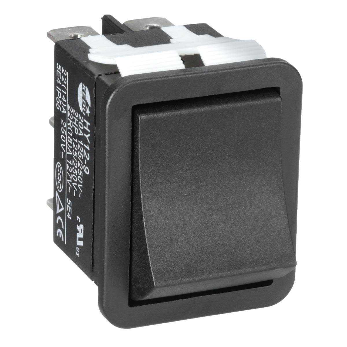 20 A Switch Rating @ 125V; 21.6 mm Overall Width; 1/4 in Quick Connect Tab Termination Style; 20 A at 125V Resistive Current; 20 A at 250V Resistive Current; 2 Number of Positions; 6 Number of Connections; 2 Number of Poles; 2 hp at 125V AC Output Power – Single Phase; Rocker Switch Actuator Type; Polyamide Actuator Material; Black Actuator Color; DPDT Pole-Throw Configuration; Maintained Switch Action; 2 hp at 250V AC Output Power – Single Phase; On-On Switch Function; Copper Contact Material; Silver Contact Plating Material; 0.05 ohms Contact Resistance; Single Phase; Yes Prewired; Snap-In Mounting Style; 1.16 in Mounting Hole Length; 0.87 in Mounting Hole Width; Non-Illuminated Illumination; AC Current Type; 250V AC Voltage; 149 ° F Maximum Operating Temperature; 32 ° F Minimum Operating Temperature; UL Listed Specifications Met; Yes RoHS Compliant; Standard Body Style; Thermoplastic Body Material; Black Body Color; 6000 Electrical Operating Life Cycles; 54 IP Rating; Household Electrical Appliances Application; China Country of Origin; 39.2 mm Overall Height
