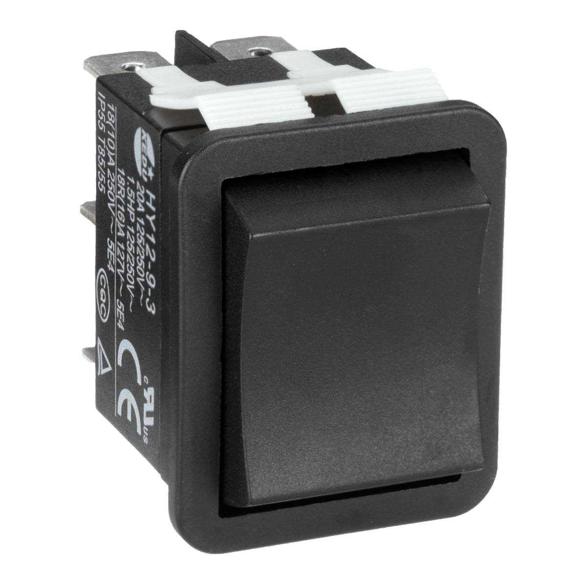 20 A Switch Rating @ 125V; 21.6 mm Overall Width; 39.2 mm Overall Height; 1/4 in Quick Connect Tab Termination Style; 20 A at 250V Resistive Current; 20 A at 125V Resistive Current; 3 Number of Positions; 6 Number of Connections; 2 Number of Poles; Rocker Switch Actuator Type; Polyamide Actuator Material; Black Actuator Color; DPDT Pole-Throw Configuration; Momentary Switch Action; 2 hp at 125V AC Output Power – Single Phase; 2 hp at 250V AC Output Power – Single Phase; On-Off-On Switch Function; Copper Contact Material; Silver Contact Plating Material; 0.05 ohms Contact Resistance; Single Phase; Yes Prewired; Snap-In Mounting Style; 1.16 in Mounting Hole Length; 0.87 in Mounting Hole Width; Non-Illuminated Illumination; AC Current Type; 6000 Electrical Operating Life Cycles; 54 IP Rating; 250V AC Voltage; 149 ° F Maximum Operating Temperature; 32 ° F Minimum Operating Temperature; UL Listed Specifications Met; Yes RoHS Compliant; Standard Body Style; Thermoplastic Body Material; Black Body Color; Household Electrical Appliances Application; China Country of Origin