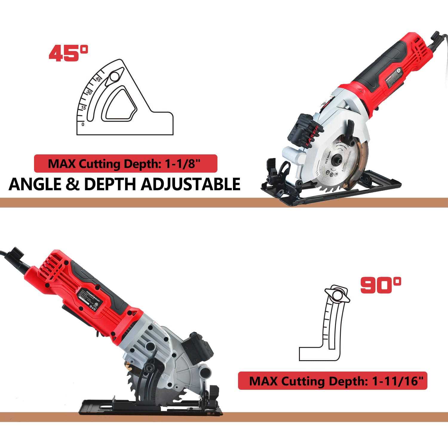 The 4-1/2 in. circular saw features a compact, lightweight design that makes it easy to maneuver. A 5.8 Amp, 3500 RPM motor combines speed with raw cutting power for handling the most demanding jobsite applications. Includes 6 blades and a dust extraction tube. The mini saw come with laser guide, scale ruler and dust port. Which can assist you to cut a straight line for when high precision is needed and leave your working area free of dust with the dust exhaust pipe. Angle adjustment for bevel cuts of up to 45°. Cutting depth up to 1-11/16′′(42.8mm) at 90°, 1-1/8′′(28mm) at 45°. It easily cuts through 2×4’s in a single pass and suitable for cutting different thicknesses.