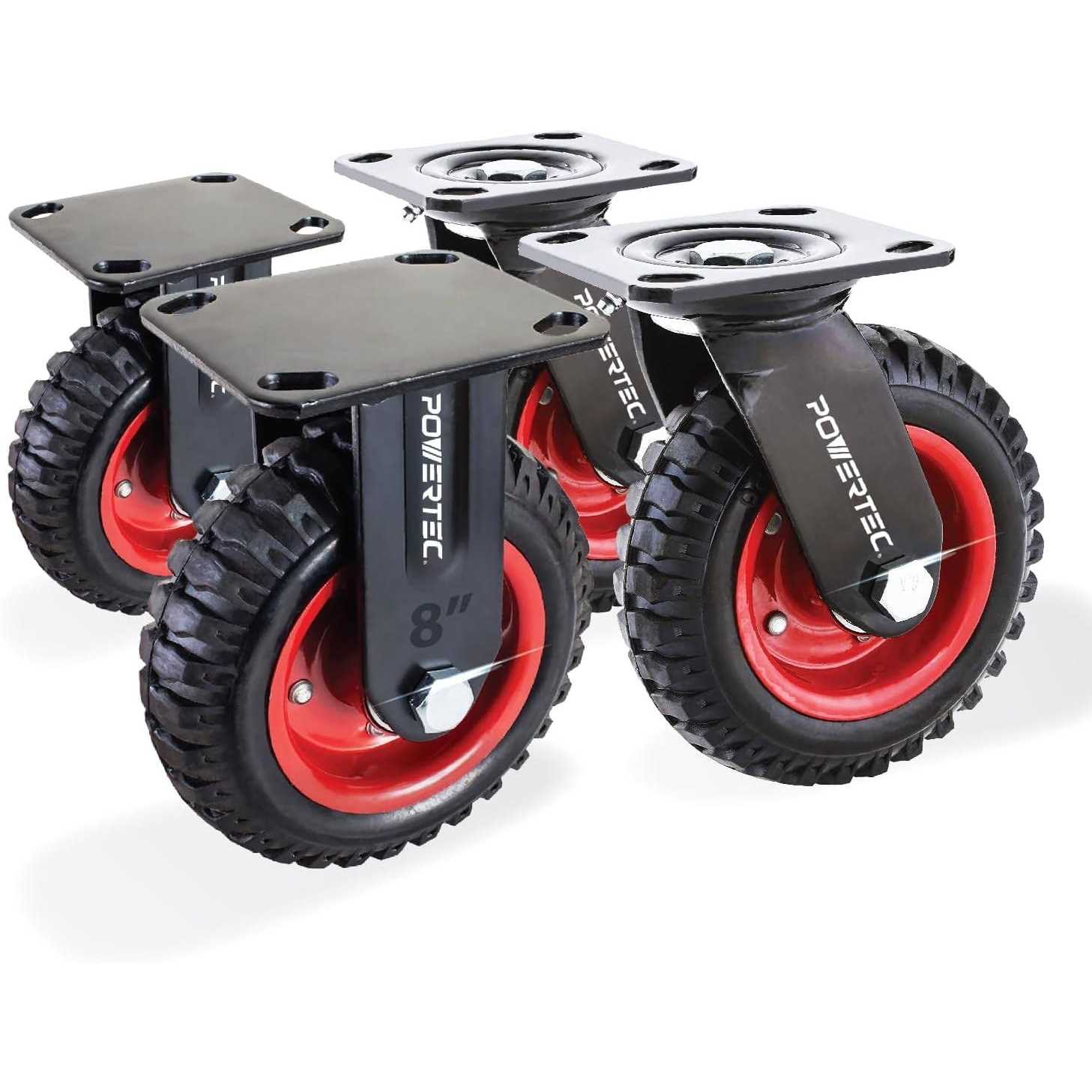 POWERTEC 8″ Heavy Duty Caster Wheels Set of 4 (2 Swivel & 2 Fixed), Pneumatic Plate Casters w/Rubber Knobby Tread for Workbench, Dolly, Cart,