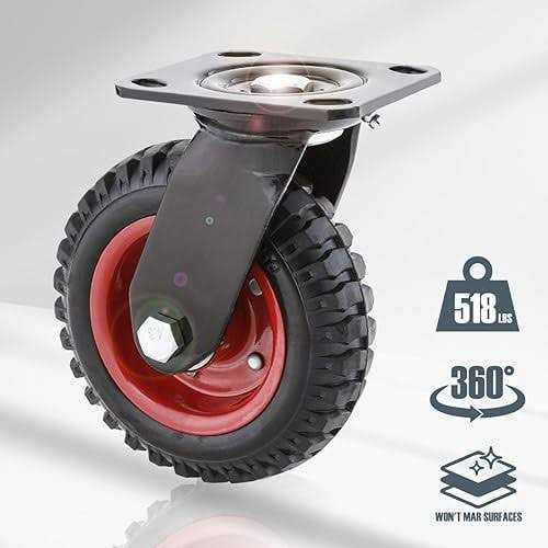 Plate Casters by POWERTEC. Details:Introducing 8 inch Swivel Heavy Duty Industrial Wheel by POWERTEC. An impressive combination of precision and craftsmanship, this well built swivel caster is conveniently constructed with a solid hard rubber all-terrain wheel. It was designed for a universal assortment of mobilized applications providing an easy rolling, noiseless and robust solution. The swivel mechanism ensures a 360 rotation, providing optimal maneuverability to make smooth transitions or to turn tight corners and face any obstacle along the way. Each caster wheel flaunts an impressive 518 lb. loading capacity perfect for an assortment of heavy lifting jobs. This simply means, the more caster wheels you add, the more you can carry. The non-marring wheels are made of solid rubber, carefully molded onto the rugged steel hub. This helps provide a ber, more durable anti-flat option that can withstand the pressure. The knobby tread material of the tire helps deliver increased traction…