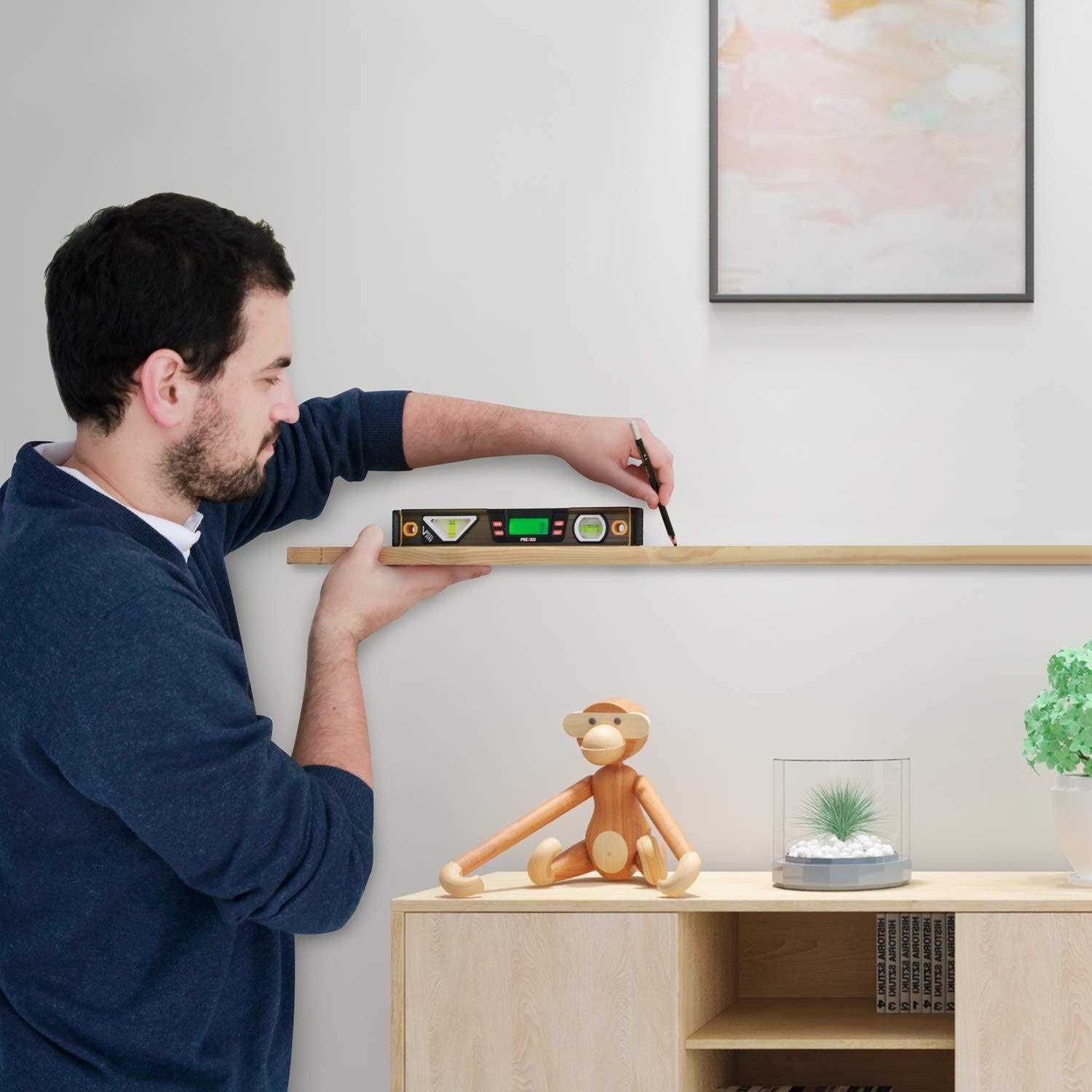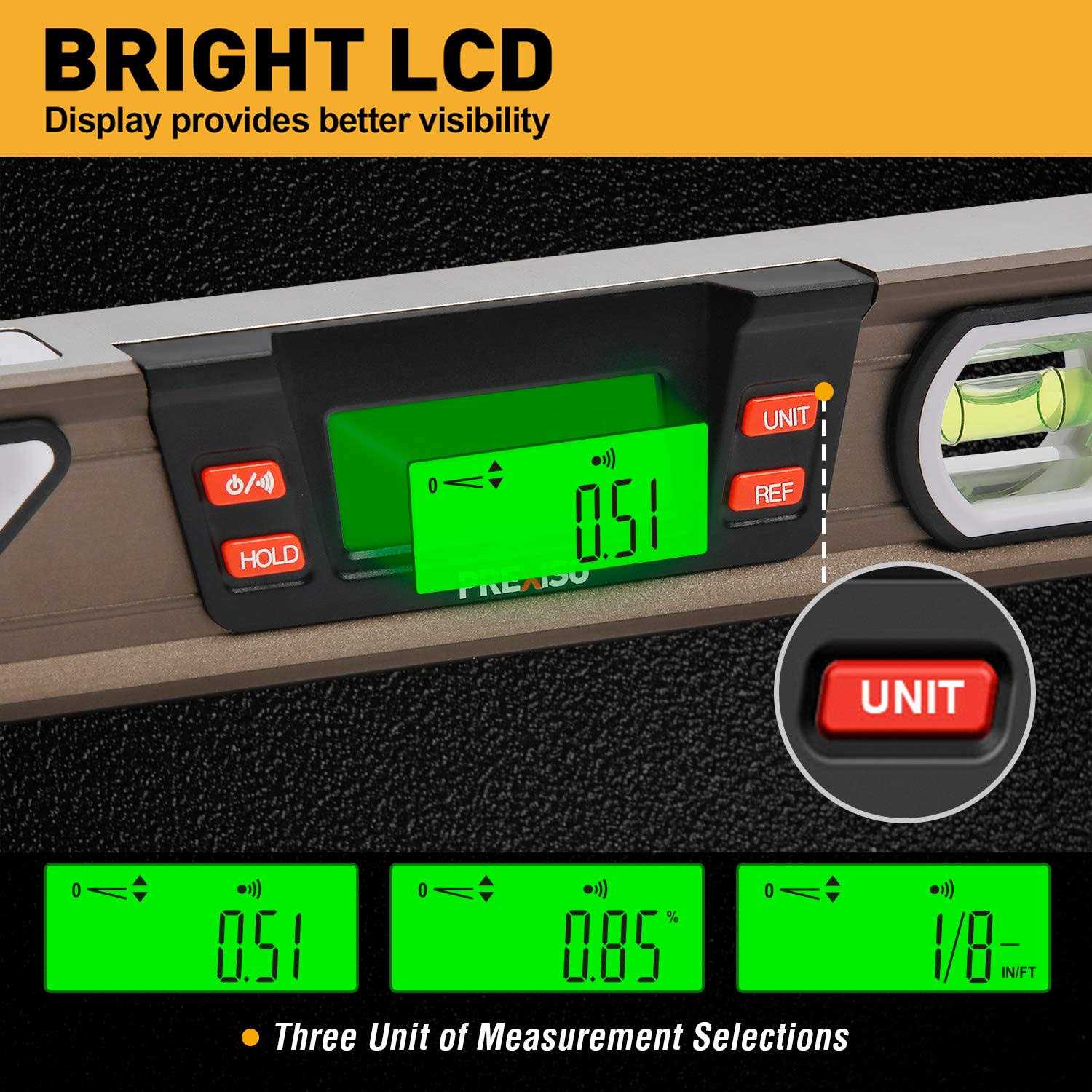 High Accuracy: Accurate to the ±0.1° at 0° and 90° and ±0.2° from -1-89°. Measure slope angles 4 x 90 ̊ (total 360 ̊) Bright LCD Display: Large bright green LCD provides better visibility, so you can easily read your measurements all day and night, even in the darkest spaces. The display value reverses automatically when the electronic level is upside down 2 Measuring Modes: Press the “hold” button to enter absolute angle mode. The value will hold for easy to read. Press the “REF” button to achieve relative measurement mode 3 Measuring Units: This inclinometer provides three different units of measurement selections: degrees, % grade, and IN/FT. You can change the required units in your measurement Audible Indicator: This level will buzz when the level is getting close to plumb or level, helping to achieve a level and 90 degrees when your eyes can’t see the display (This version has no magnetic function) PREXISO 11-1/2in/290mm digital level angle slope