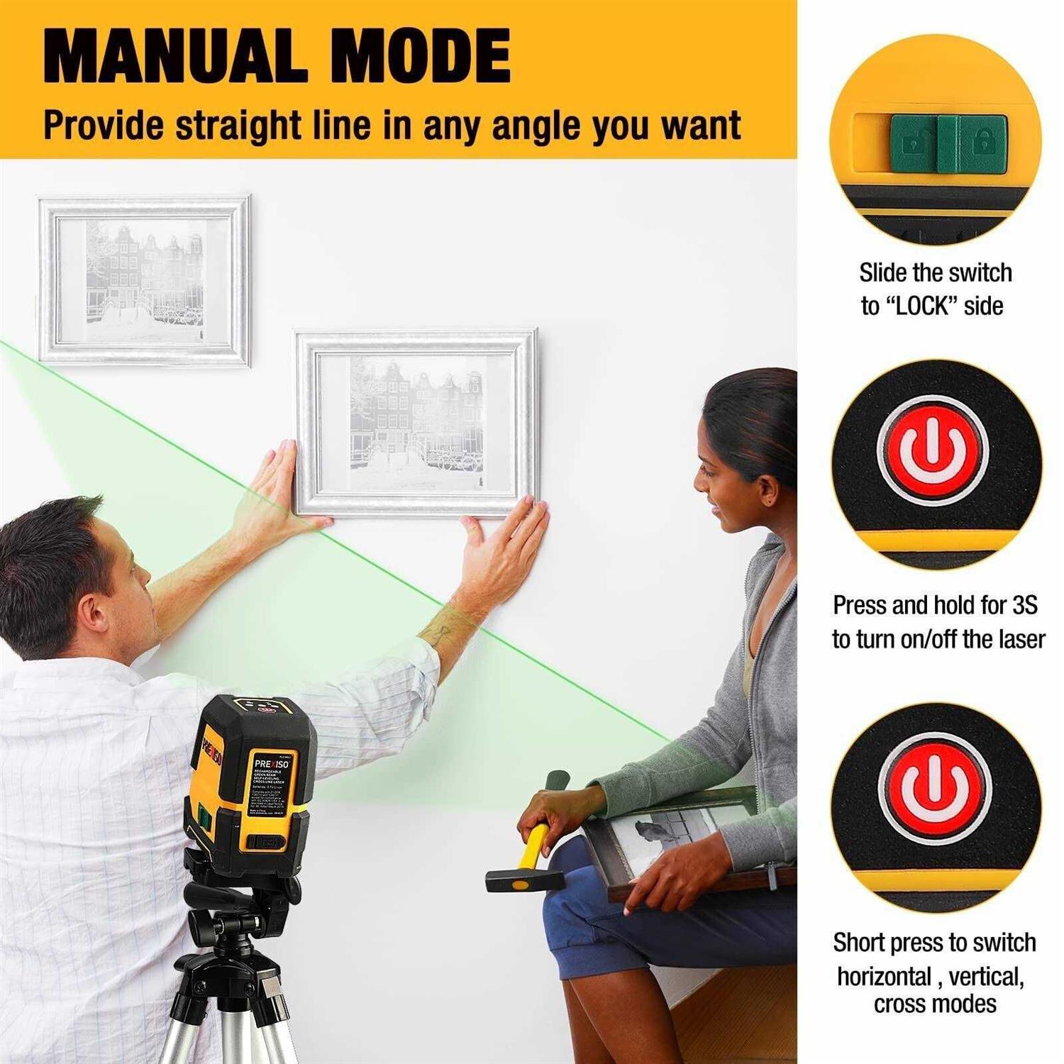 Dual Modules & 3 Projecting Modes: PREXISO line laser has two laser sources. Laser level of professional laser head is more accurate. Suitable for wide uses such as paving tiles installing carpentry for doors windows or furniture hanging wallpaper etc.