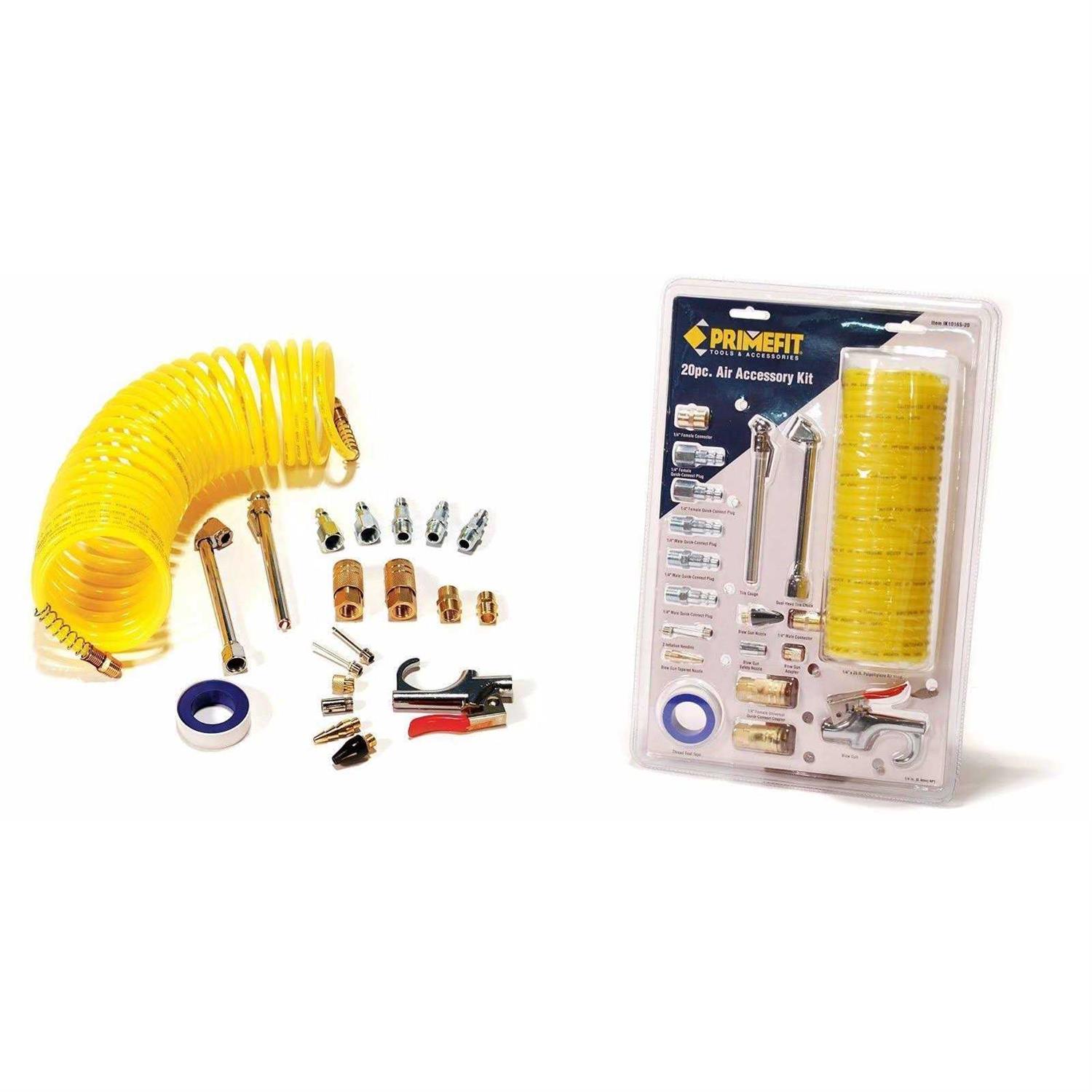 The Primefit IK1016S-20 Air Accessory Kit has all the most commonly used air compressor accessory items in one set, such as a 25-foot recoil air hose. Included in the kit are all of the essentials like a blow gun with four different nozzle attachments, two quick connect couplers, five quick connect plugs for a variety of tools, a dual air chuck for tire inflation, a tire gauge, two sport ball inflation needles, PTFE sealant tape and two air hose connection fittings. Primefit Inc. and its affiliated companies have been one of the leading global manufacturers of Pneumatic Tools, Air Accessories and Air Hoses since 1976. Primefit produces a broad range of industry leading products serving the Consumer, Automotive, Commercial and Jobsite pneumatic markets.