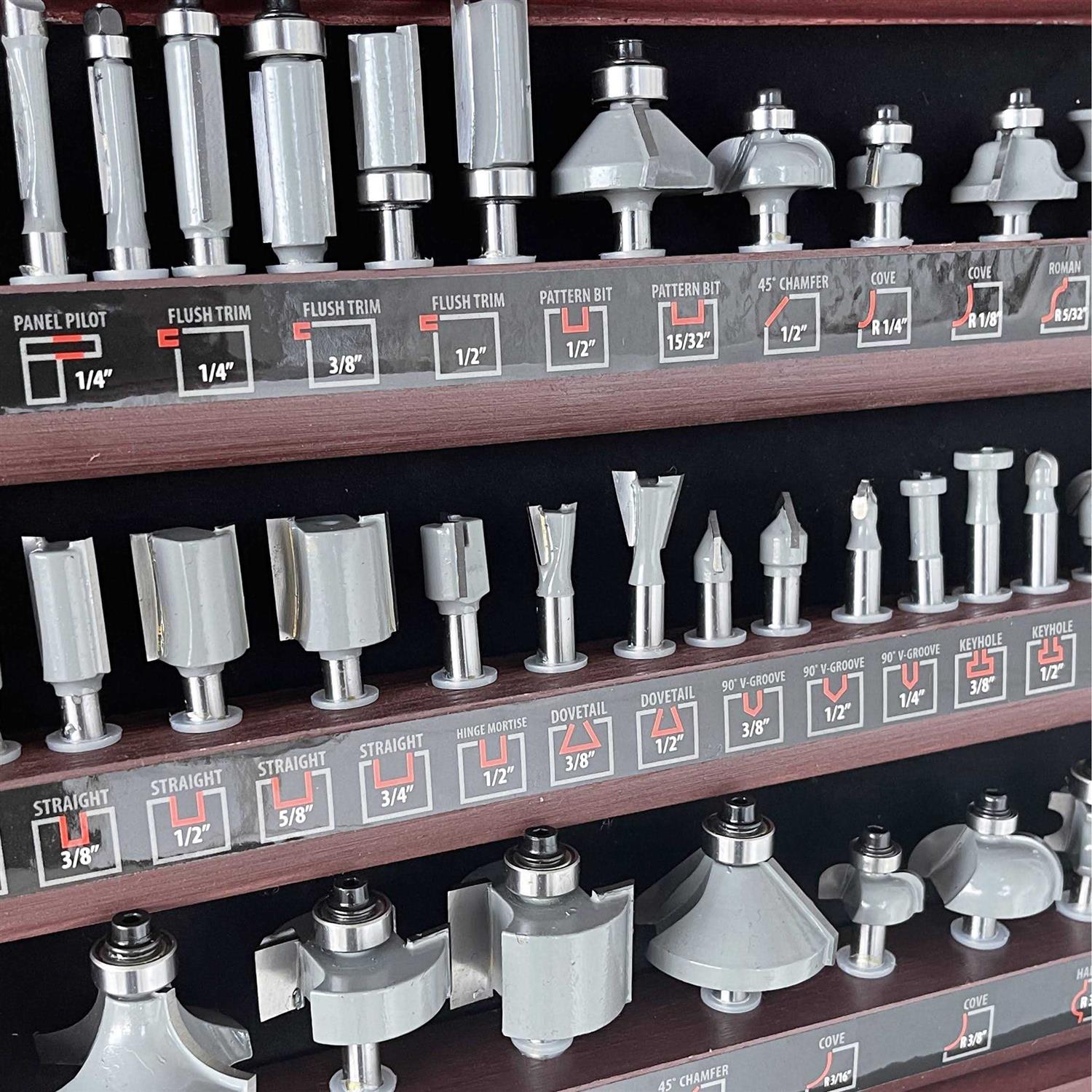 Cutting Patterns on Wood is Made Easier with the Buffalo Tools Pro-Series Router Bit Set with Wooden Box The Buffalo Tools 40pc. router bit set is a great pick for DIY hobbyists and professional woodworkers. The bits come organized in a durable wooden box. This kit includes 18 standard bits and 22 ball bearing regular bits so you can experiment with different patterns on wood. The set has everything you need for joining, veining and decorative edging.