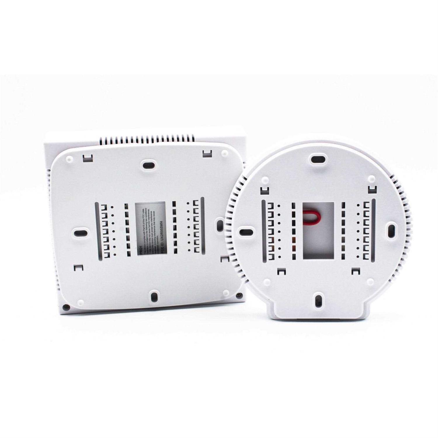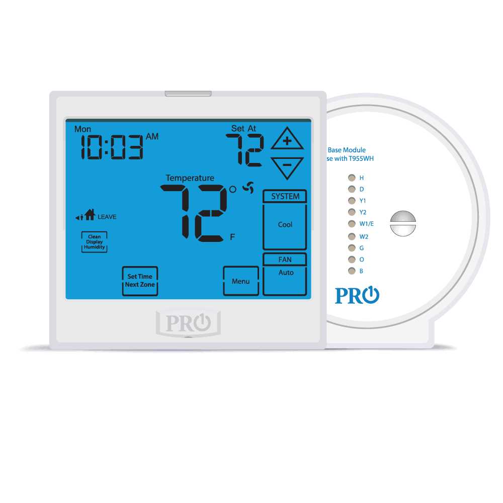 The Pro1IAQ Model T955WH Touchscreen Wireless Thermostat Kit provides a stand-alone wireless thermostat solution. It can be expanded with the addition of other wireless accessories. This touchscreen wireless universal thermostat provides support for most 24VAC heating and cooling systems – up to 2H/ 2C and up to 3H/ 2C for heat pumps. This kit includes a wireless thermostat and base module. The thermostat can be located anywhere while the base module wires directly to the HVAC equipment. The range between the T955WH thermostat and the base module is up to 100 feet with no obstructions and up to 50 feet in standard residential construction.