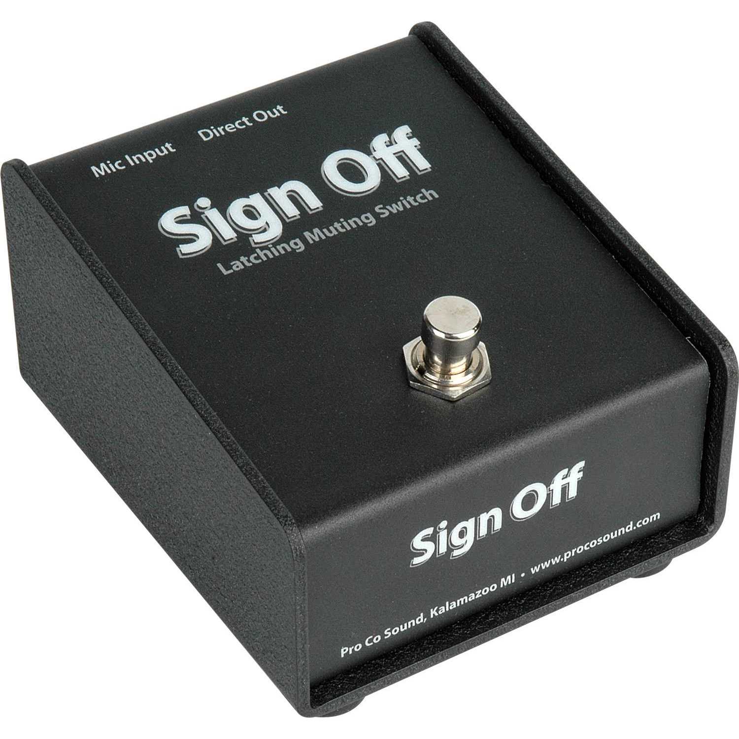 Latching Microphone Mute Switch Sign Off represents a name change for the original Pro Co Cough Drop L version, a passive latching microphone muting switch (press to mute, press again to unmute). To operate, the user and apos;s microphone cable is plugged into the Sign Off and the Sign Off is plugged into the sound system. If the entertainer has to cough or clear his/her throat, the user steps on the Sign Off to mute the microphone and apos;s signal. Pressing the switch again unmutes the microphone and resumes regular communication with the audience. Designed especially for singing drummers, the Sign Off will work well for any entertainer who needs a latching rather than a momentary microphone muter. Features: Latching mic-muting switch Can be used with condenser or dynamic mics.
