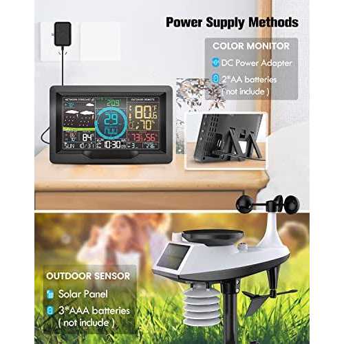 【All-in-One Outdoor Sensor】The professional outdoor sensors include solar panels, rain gauges, temperature and humidity sensors, light and UV sensors, weather vanes. It offers unparalleled accuracy and reliability, providing you with up-to-the-minute data on temperature, humidity, wind speed, and more. The durable outdoor sensor and sleek indoor display make this weather station the perfect addition to any home or professional setting. 【Mulitifunctional Color LCD Display】 With clear, easy-to-read 7.5″ display, you can quickly and easily view real-time data on indoor/outdoor temperature&humidity, wind speed, air pressure,calendar,UV idex, today’s forecast highest and lowest temperature, weather forecast, alarm clock etc. Our weather station’s high-quality display will provide you with the information you need in a clear and concise format. 【WI-FI Wireless Transmission of Real-Time Data】The data from the outdoor sensor is synced to the mobile app in real time, you can easily monitor and log real-time data on temperature, humidity, wind speed, and barometric pressure , It also can export historical data. In addition, It also has a alarm function, setting the temperature and humidity warning on APP, When the temperature and humidity exceed the set range,It will automatically send an alarm message. 【High Quality Prediction Ability】The WI-FI weather station uses advanced meteorological models and algorithms, combined with real-time observational data, to forecast future weather conditions and provide high-quality and reliable weather forecasts. At the same time, it uses high-precision sensors to collect data and performs scientific processing and analysis to provide accurate weather information 【2 Energy Supply Methods & 2 Installation Methods】The HEYAXA outdoor sensor offers two energy supply methods. It can be powered by batteries or automatically charged using the solar panel on the sensor, which is more energy-efficient and environmentally friendly. Our LCD display screen can be connected via a data cable or powered by batteries.
