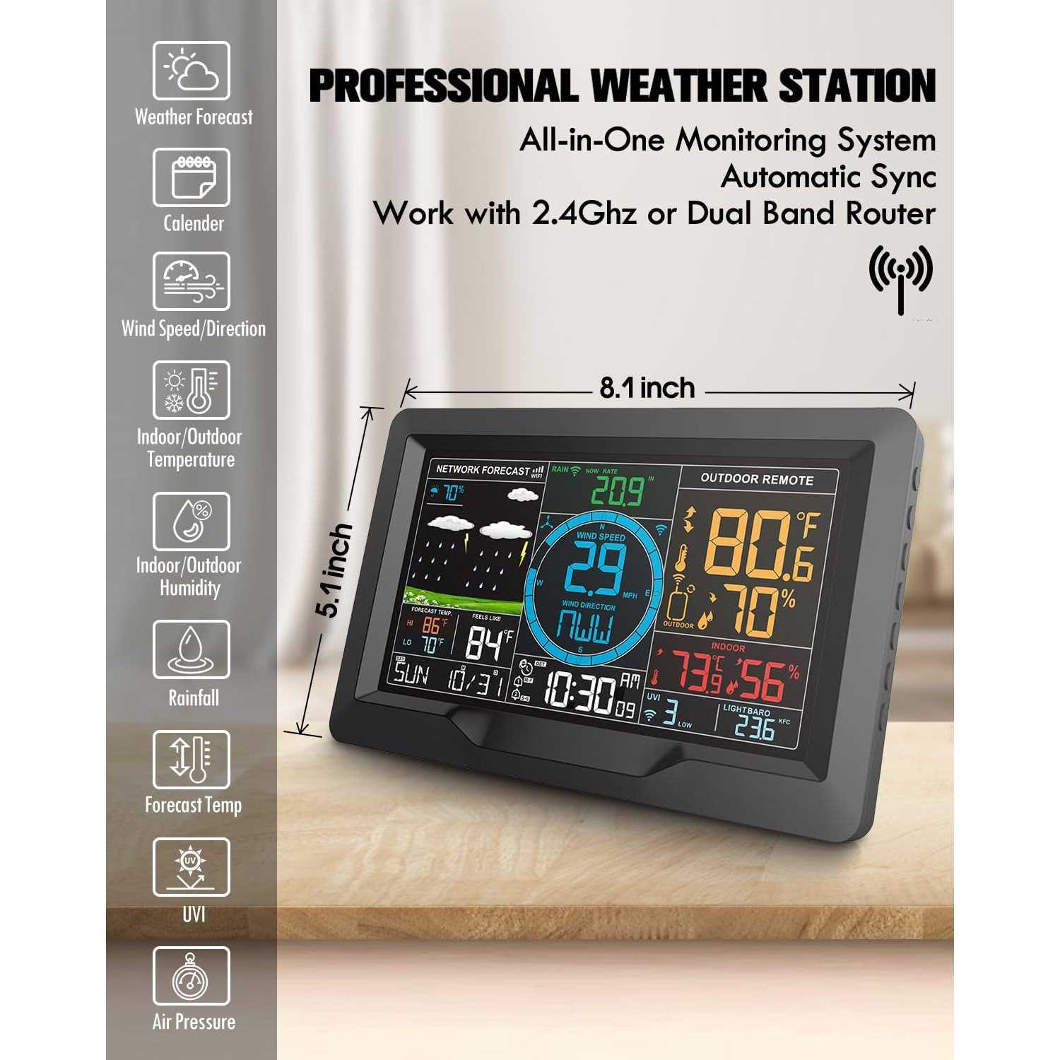 Professional WI-FI Weather Station with Wireless Outdoor Sensor, Color LCD Display with APP Data Logging and Alerts