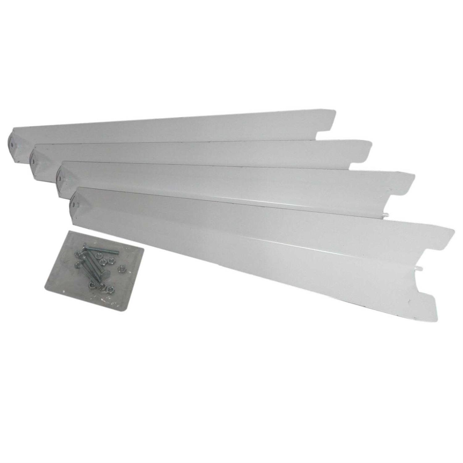 Four inch center set faucet holes pre-drilled. Includes white baked enamel steel angle legs. Mounting block for clamp on faucet: PFLTBLK. Polypropylene construction with integral strainer.