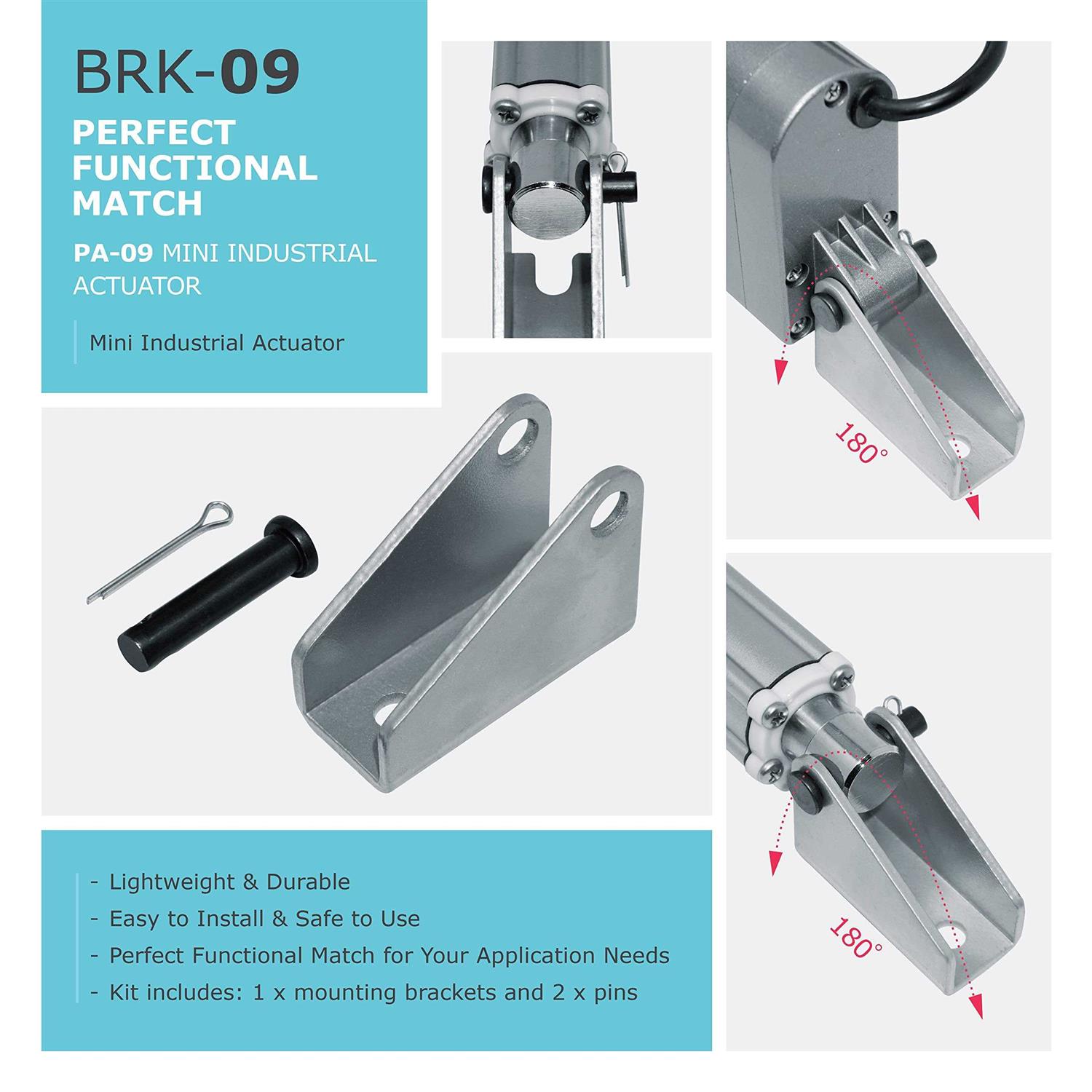 - The BRK-09 bracket, compatible with the PA-10, can be used on either the stroke or motor-end mounting locations and allows for over 180 rotation.