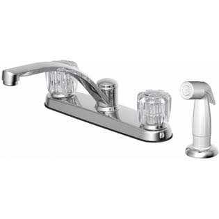 Looking for a new solution to your kitchen sink necessities? This Project Source kitchen faucet gives you solid features and value. This traditional-style faucet features a chrome finish that shines brightly and two acrylic handles that complement the look. The low-arc faucet operates smoothly with a drip-free washerless cartridge, so leaky faucets are a thing of the past. Use the clearly marked hot and cold handles to adjust your water to the perfect temperature. Add this faucet to your kitchen for a fresh, clean look.