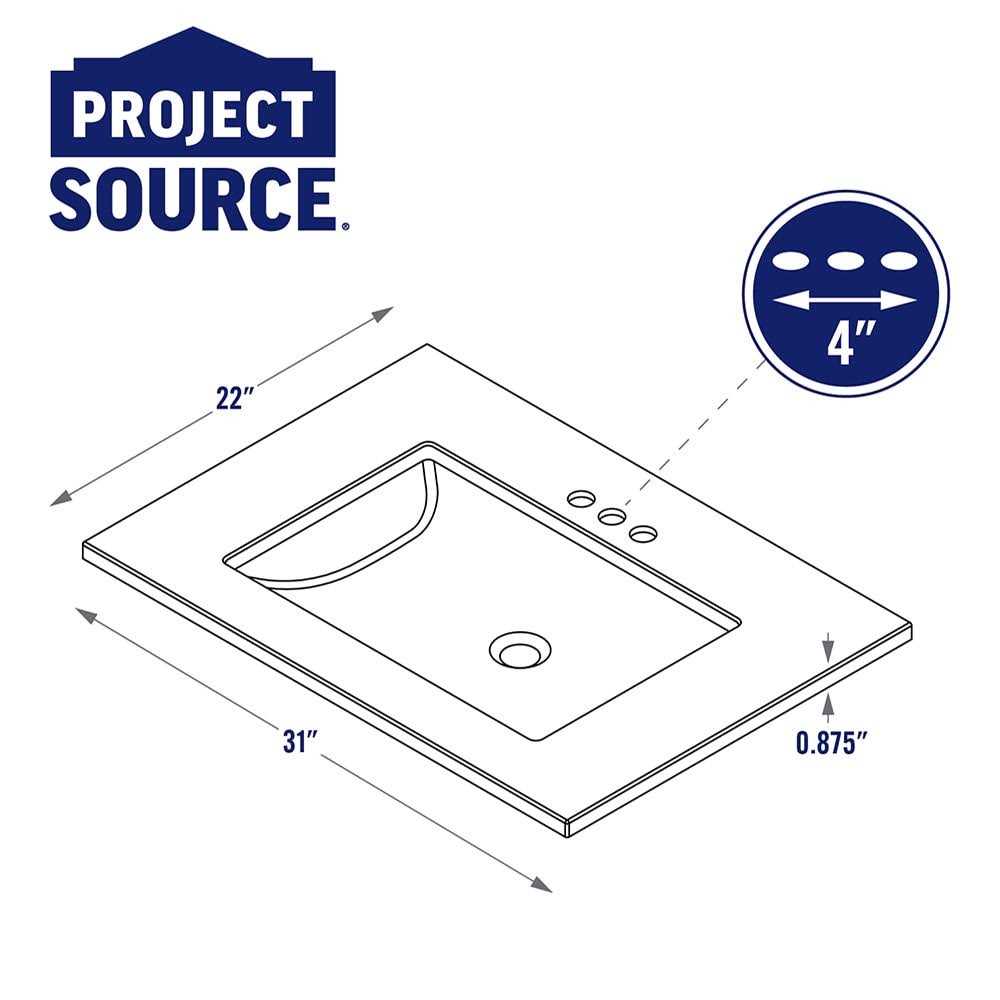 The 31 inch Cultured Marble Vanity Top with integral rectangular basin in white is the perfect complement to finish off a 30-in vanity. This top measures 31-in W x 22-in D and fits most 30 inch vanities with center basin orientation. The clean lines of this vanity top make it an ideal solution for many styles and trends. Pair with the 31-in Cultured Marble Backsplash (Item # 2694702) and a Cultured Marble Sidesplash (Item # 2694697), sold separately, to complete your look and provide added protection to your walls against excess moisture. For your convenience, this vanity top is predrilled with holes to accommodate a 4-in centerset faucet (sold separately).