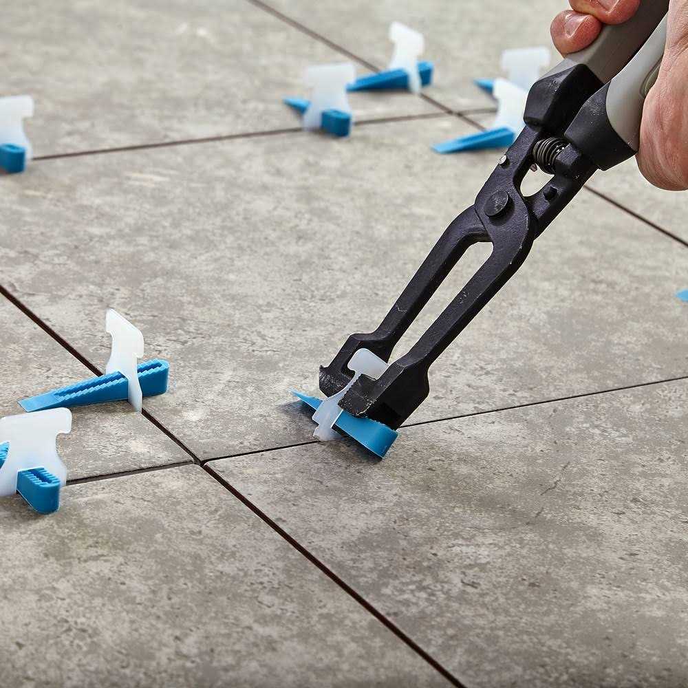 The tile level system is great to remove the tile slippage and crest perfectly leveled surface for both floor tile and wall tile. It includes clips (A), wedges (B) and pliers . They are used with tile between 3/16 in. and 7/16 in. thick. The clips (A) can provide 1/16 in. grout line. The system is very easy to use. Just slide two clips (A) under the tile approx. 2 in. from each end of the tile. And then slide a wedge (B) into each clip. Tighten with pliers until tiles are snug against bottom of the wedge. Move tiles so that slides are aligned and tiles are pushed tightly against clip (A). Let mortar dry and use the pliers or kick side of clips (A) to nap them off. Wedges (B) and pliers can be reusable. All are sold separately. Create perfectly leveled surfaces for floor tiles The leveling system includes clips A, wedges B, and pliers C Pliers are drop forged steel for durability Patented designed break-off point on clips for swift removal