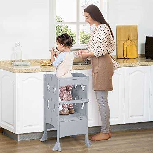 Qaba Wooden Kitchen Step Stool for Kids, Foldable Toddler Tower, Helper Stool for Kitchen Counter with Support Handles Safety Rail, Gray – Grey