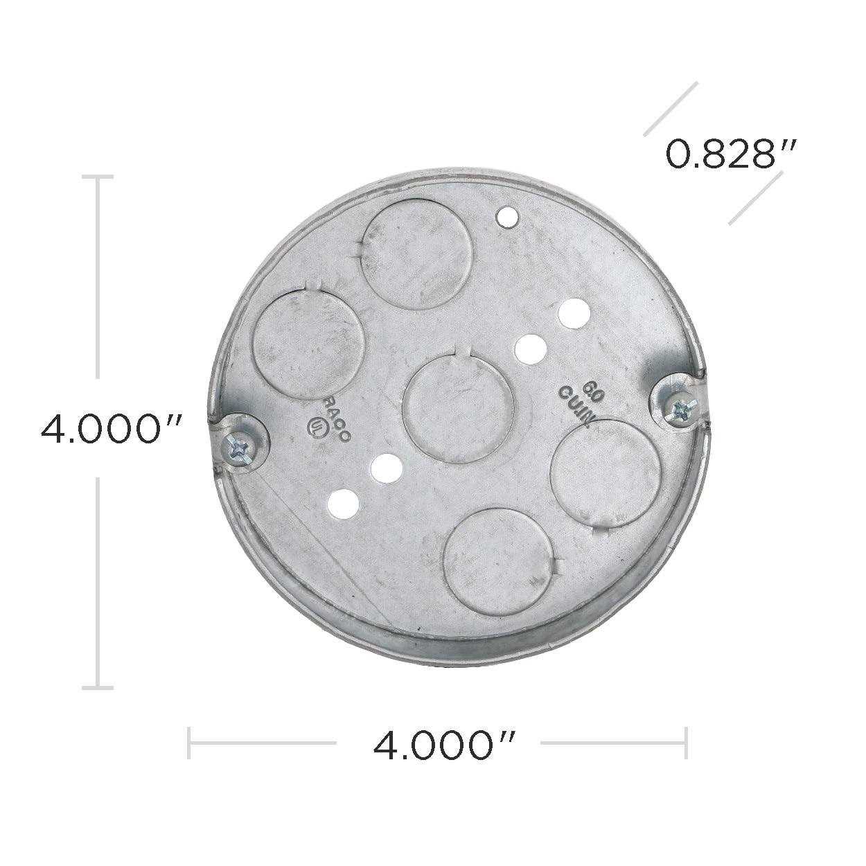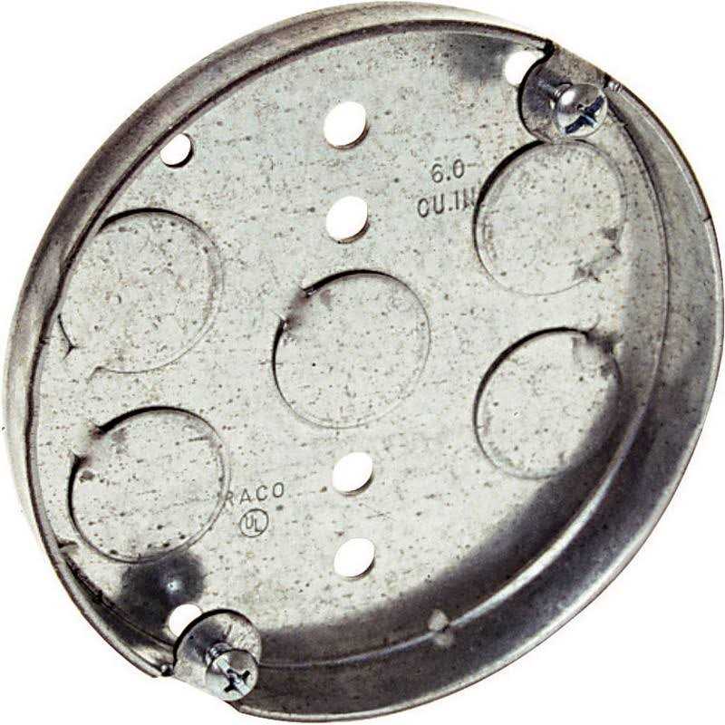 Raco 4″ Steel Ceiling Pan. 1/2″ deep. 5 bottom knockouts 1/2″. 6.0 cubic inch capacity. UL listed.
