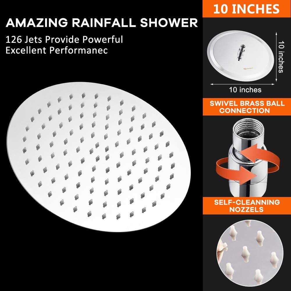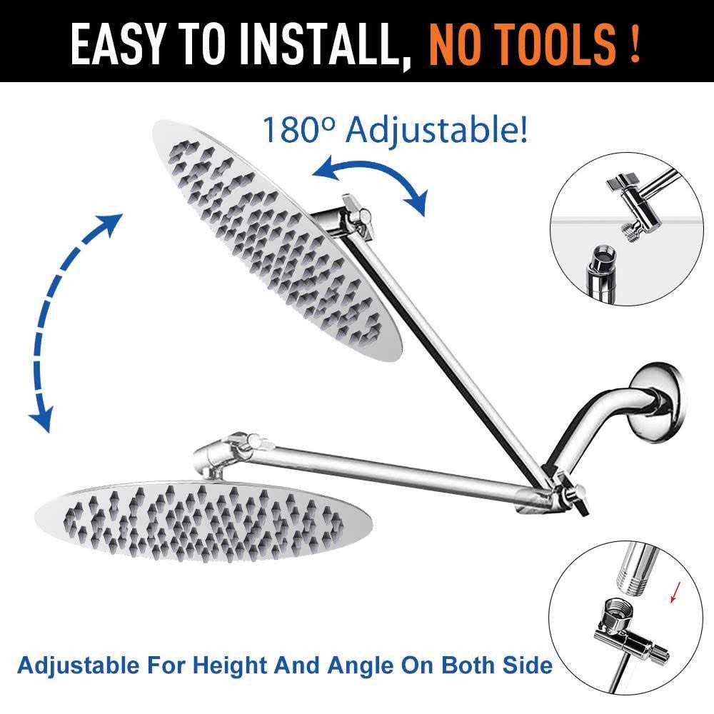 Size Name:10-Inch Shower Head with Arm | Colour Name:Chrome This is our modern high pressure luxury stainless steel rain Round shower head with 11 inch Adjustable Extension Arm. It is perfect for you bathroom. With it you could have a wonderful bath every day since the rainfall. Features: No Tool Installation: Remove the original one and install the shower head with hands, no tool is required. The whole process spends few minutes. No clogging and dripping: Flexible silicone nozzles stop lime scale from sticking which prevents the holes from getting blocked and dripping. Premium Material: 100% High quality stainless steel, PVD multi-layer plating process, let the shower head glossy and smooth mirror-like and easy cleaning, as well as super anti-corrosion and anti-oxidation performance. The thickened joint is to prevent breakage, and the filter gasket ensures secondary filtration to keep your health. Saving Water: Using less water than other thick rain showerheads, but providing good water pressure. Rotating Connector: The swivel ball design in connector allows to adjust the angle of the shower head in 360, let you have a variety of shower experiences. Ultra-thin Design and Advanced Air Booster Technology: Double pressure boost from thickness and air-pushing offer consistent powerful rainfall shower experience even under low water pressure. Specification: Material: 304 Stainless steel Body Function: bath shower head Shower head: waterfall style Shape: Round Size: 10 inches Thickness: 0.08 inch Connection: stand 1/2” Color: Mirrored stainless steel Package included: 10 inches Round Shower Head*1 11 inch Shower Head Arm*1 Extra Pipe Sealant Tape*1 Extra Filters*1 User Manual*1 Special wrench*1