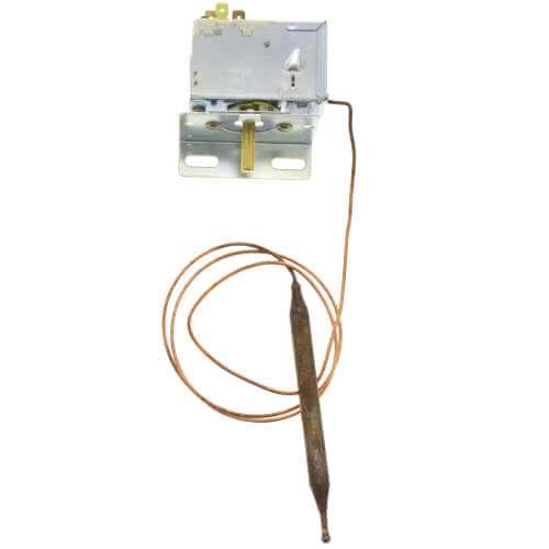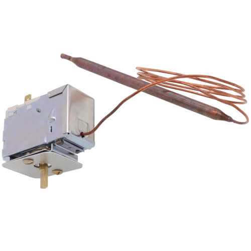 This C series single-stage room A/C control has an open/close SPDT switch. It has an operating temperature ranging from 60 to 98 degrees Fahrenheit. The room control operates at 125V to 277V AC and measures 3 height x 3 inches depth. It has a capillary length of 36 inches and a 3/8 inch bulb diameter. The control is suitable for use with a single-stage heat/cool packaged terminal A/C.