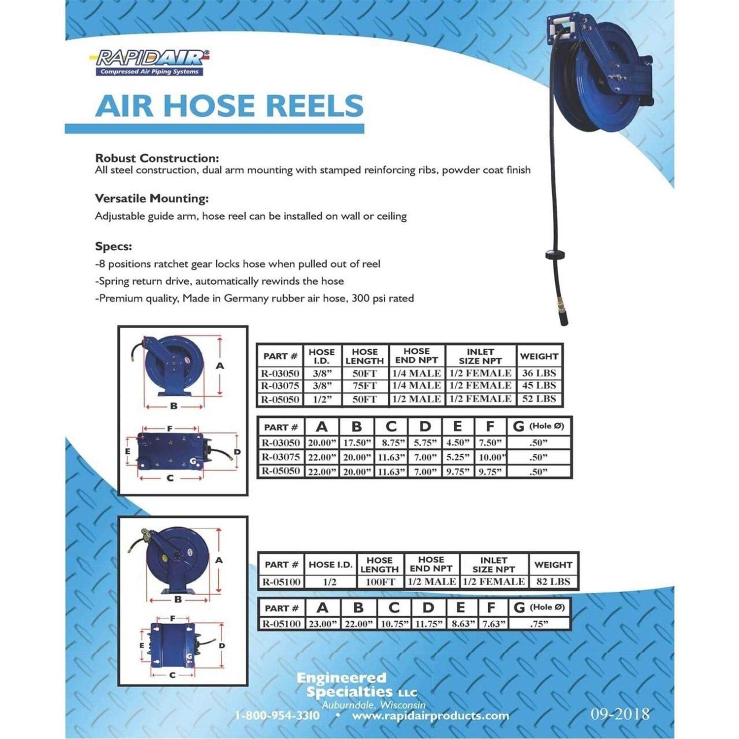 Rapid Air R-03050 Auto Rewind Air Hose Reel Bring compressed air to your project by installing this retractable air hose and real by Rapid Air. The premium hybrid hose alone makes it work the investment. A half-inch female inlet can be linked to a Rapid Air outlet kit or directly to the compressor.The hose comes on an all-steel retractable air hose reel that you can mount to any flat surface. An eight-position ratchet gear locks the hose in place as you pull. When you’re done with a project, give the hose a tugthe spring return drive will automatically rewind it for a tidy, effortless clean-up.
