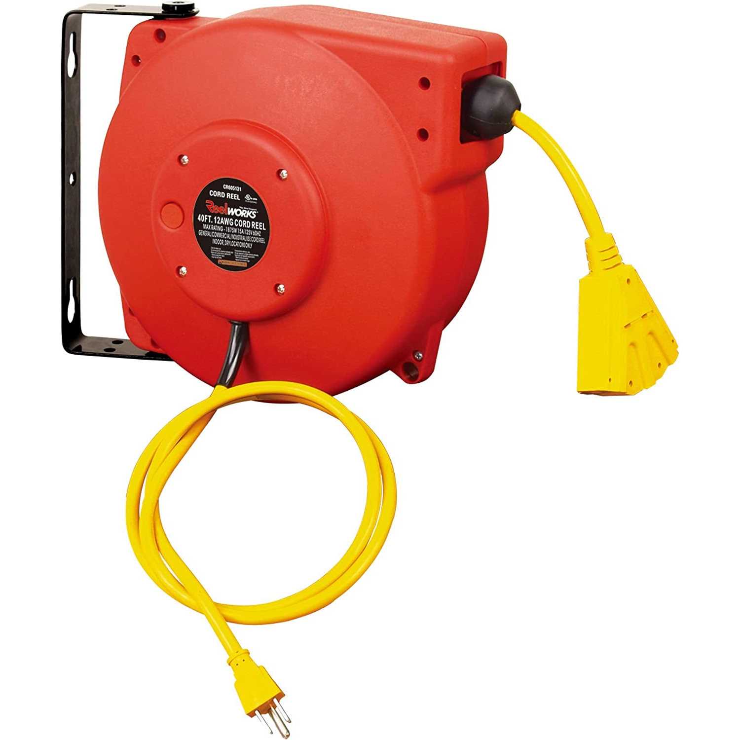 The Reelworks CR605131S3 cord reel features a 40 ft., 12AWG/3C SJT, triple Tap cord that allows you have power when and where you need it. The Spring driven retractable feature with latch keeps the cord where you want it when in use and quickly store it away when finished. The impact resistant Polypropylene case with attached swivel bracket can be attached to walls or ceilings helping you keep electrical cords out of the way when not in use. 60 in. Lead in cord is included. Reelworks has become a major player in the global hose and cord reel market. Reelworks has continued to enhance its brand image and accumulates vast experience in designing both independent reels and reeling systems as an original equipment manufacturer. All Reelworks product parts are ISO 9001 certified, CE, etc., and cull quality tested and approved. Quality control tests Check products for Spring endurance and swivel leakages. Our in-house research & development team continuously works to provide creative and efficient solutions for all your reeling needs. Reelworks is proud to be the leading hose reel manufacturer in the market.
