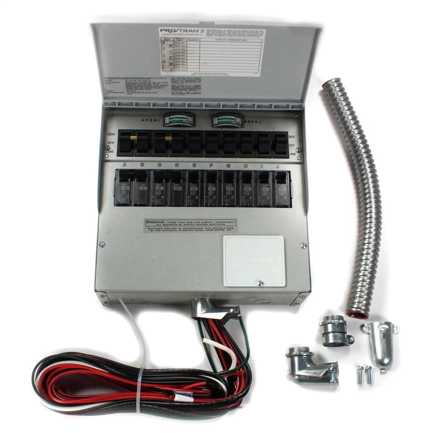 The Pro/Tran 2 is the next generation of Loadside manual transfer switch by Reliance Controls. These indoor surface mount transfer switches are designed for fast installation in residential and commercial applications. The 16 Inch flexible conduit whip attaches easily to a knockout on the load center and all factory wires are clearly marked and colored for identification. Simply select the circuits needed in an emergency and connect them to the Pro/Tran 2-wire leads as instructed in the manual. Pro/Tran 2 transfer switches feature a rugged powder coated steel cabinet with six combination 1/2 Inch and 3/4 Inch knockouts, and 1 Inch interchangeable circuit breakers. The 1 Inch breakers allow a larger circuit size (maximum of 1 x 30 Amp 2-pole), and installation of AFCI and GFCI breakers. All models include a hinged detachable cover to help protect and finish off the overall look of the product. All models are UL listed for most brands of 1 Inch interchangeable circuit breakers and can be easily re-configured in the field for multiple 2-pole circuits. The Pro/Tran 2 still utilizes non-defeatable (break before make) double throw toggle switches. Many models feature new color coded watt meters to help balance and manage the generator load.