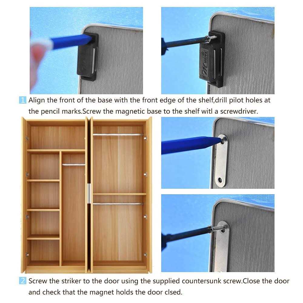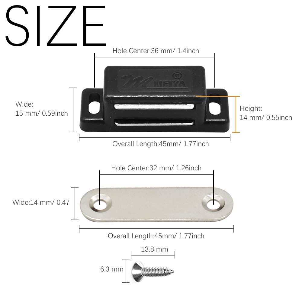 Package: 12pcs black 1.7inch magnetic catch with 48 pieces screws. Made from durable plastic and steel metal plate, our white magnetic cabinet catches are designed to last and last. Strong Magnetic to hold cabinet door, furniture door. Ideal for cabinets used to store cleansers, knives, tools, prescription drugs, etc. Application Widely : Rustproof and Durable Ideal for use in bedrooms, bathrooms, kitchen and closets.