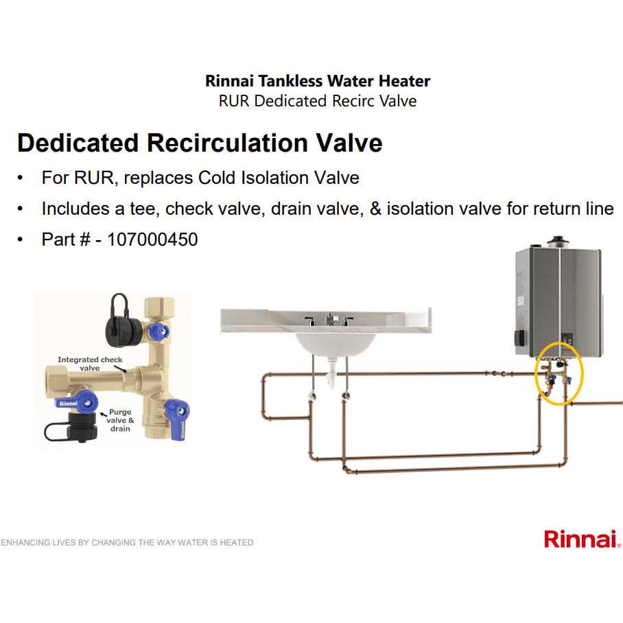 Rinnai is introducing its new dedicated return valve (DRV) which makes installation a snap on any plumbing system with a dedicated recirculation line. The DRV is a two-piece fitting with ¾” FNPT connections. It contains an internal spring check valve to prevent backflow of the cold-water supply line into the dedicated return line. The DRV has ball valves and drain ports on both on the cold water inlet and the return line, so that you can isolate and purge either section of the plumbing system.