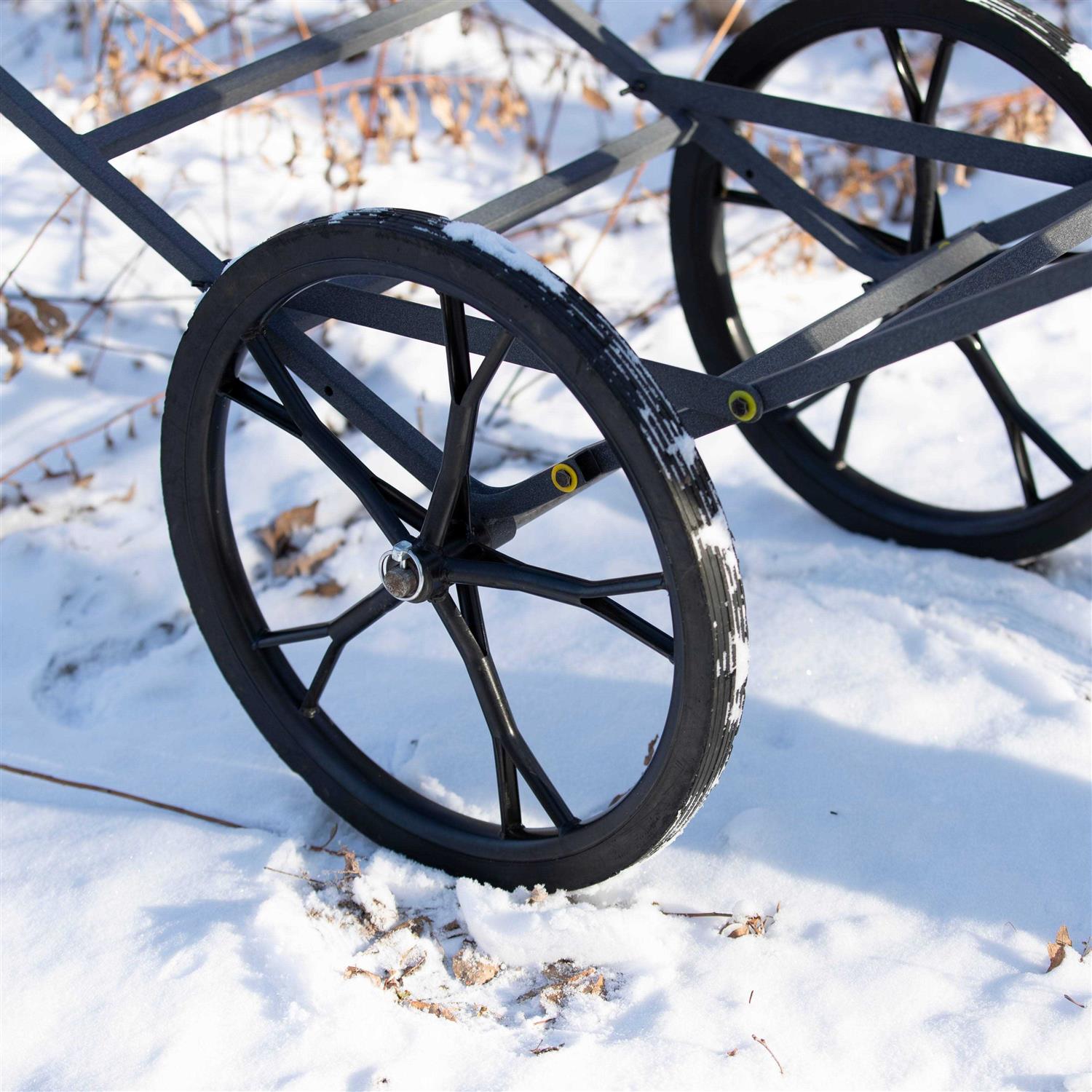 The Rivers Edge Game Cart features a unique tri-fold design that allows the cart to fold down for easy transport and storage. It is made with steel wheels and solid rubber tires that won’t go flat. The Rivers Edge Game Cart was designed with excellent weight distribution and a 300-pound hauling capacity.