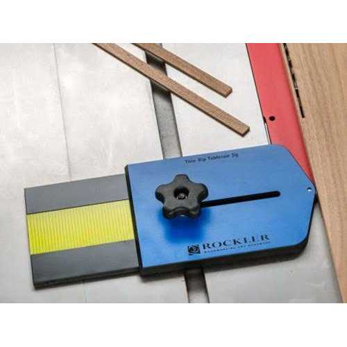 Rockler’s Thin Rip Table Saw Jig provides a safe and accurate way of ripping narrow strips. It is secured into the mitre slot and adjusted to the position required, with the fence being moved over so the workpiece is referenced from it each time giving consistent rips. The thin strip is not captive between the blade and fence making the operation a lot safer and repeatable.