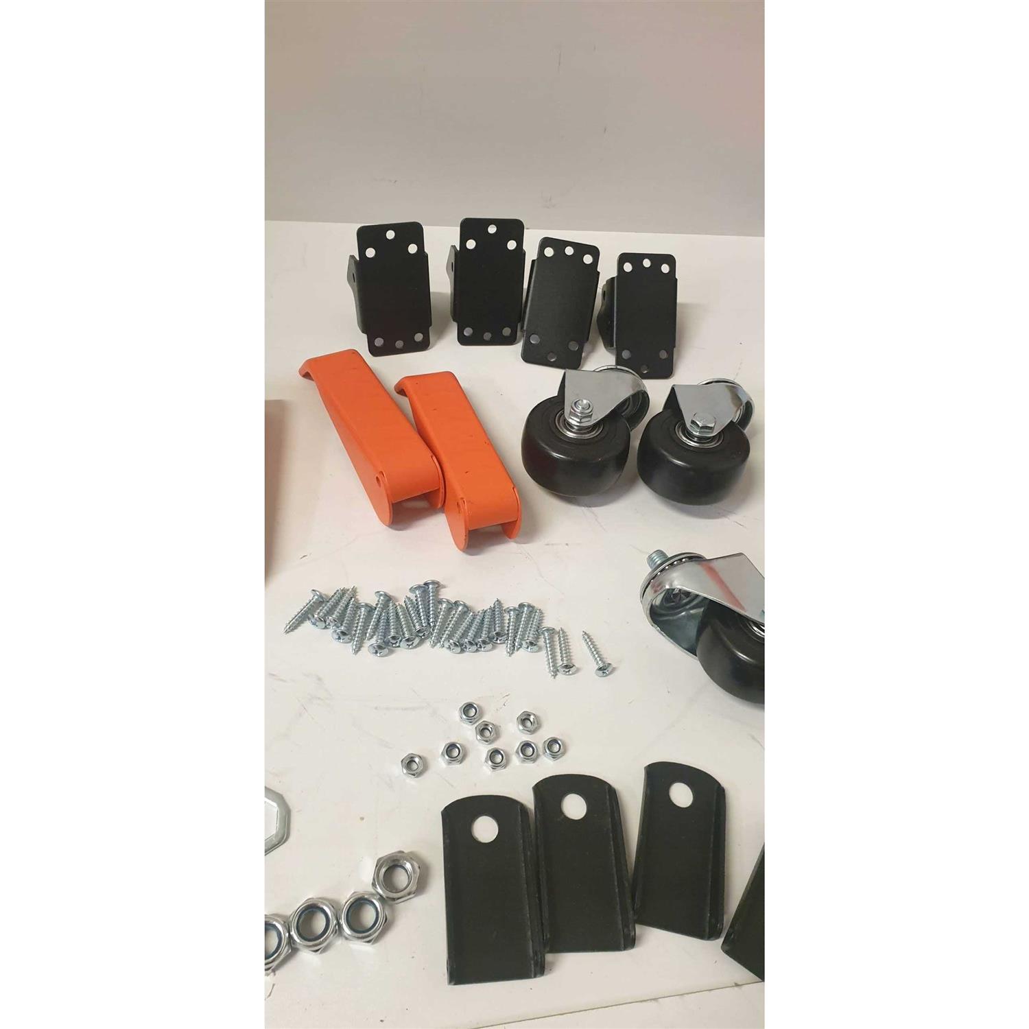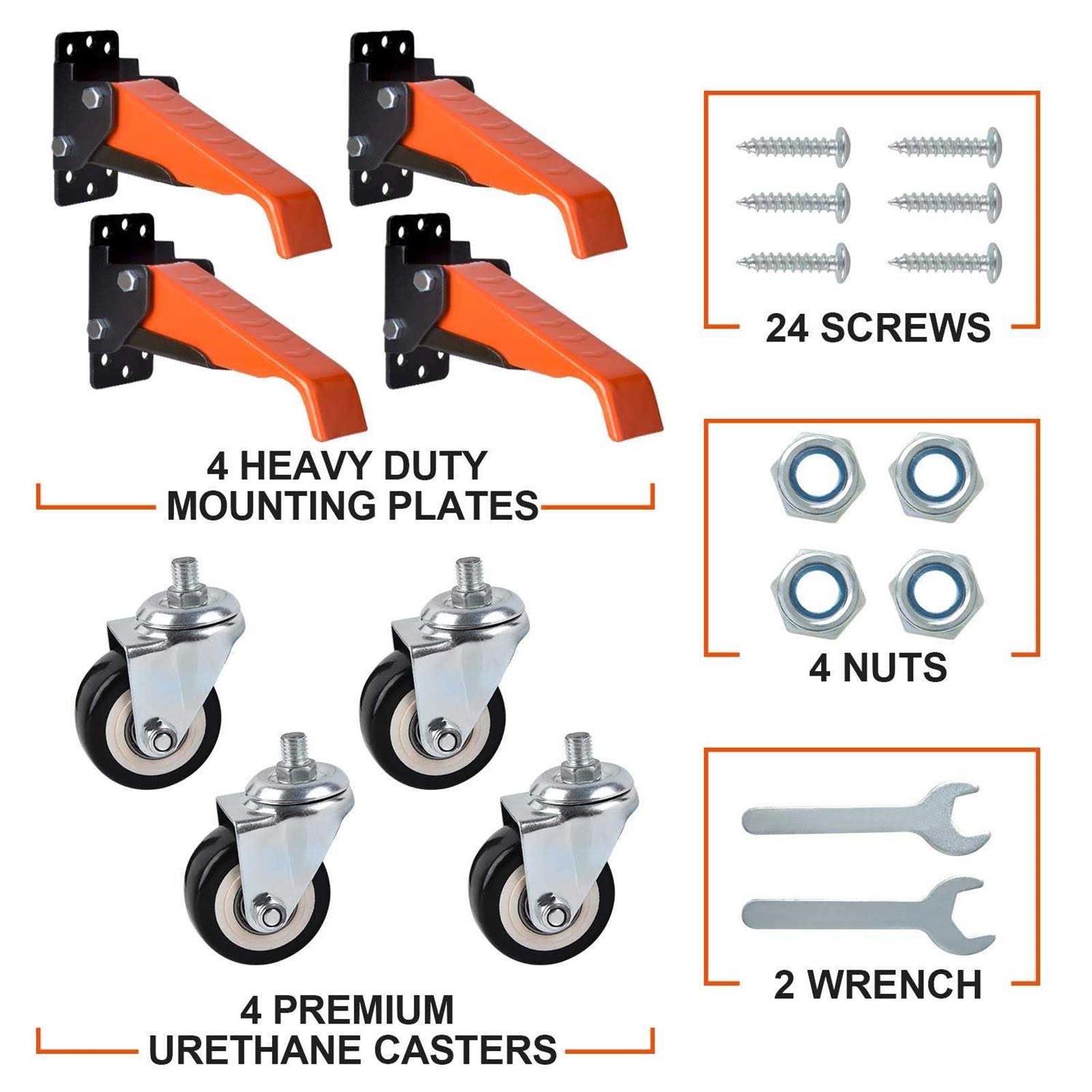 Good workbench wheels. 【Non-slip Retractable Casters】: Each foot pedal is orange powder-coated and with non-slip texture allow for secure and effective operation while providing extra grip. 【Side Mounted Caster Kit】: Set includes 4 mounting plates 4 swivel urethane casters 24 mounting screws 4 mounting nuts 2 wrenches and a manual for quick install.