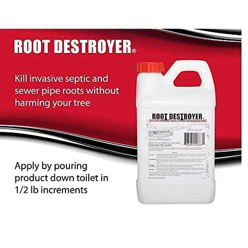 Made up of copper sulfate crystals that will kill invasive septic and sewer pipe roots without harming your tree. Root Destroyer will temporarily reduce bacterial action, but will return to normal approximately 15 days after treatment. Only roots inside the leach line will be killed. Do not apply through sink or tub drains. Use Root Destroyer at the rate of 2 lb. in an active 300 gallon septic tank 2 twice a year or anytime you have reduced water flow thought to be caused by root growth occurs. In 1/2 lb. increments, pour Root Destroyer into the toilet bowl nearest the sewer line and flush; repeat this process until the recommended dose has been added. Made up of copper sulfate crystals that will kill invasive septic and sewer pipe roots without harming your tree. Root Destroyer will temporarily reduce bacterial action, but will return to normal approximately 15 days after treatment. Only roots inside the leach line will be killed.