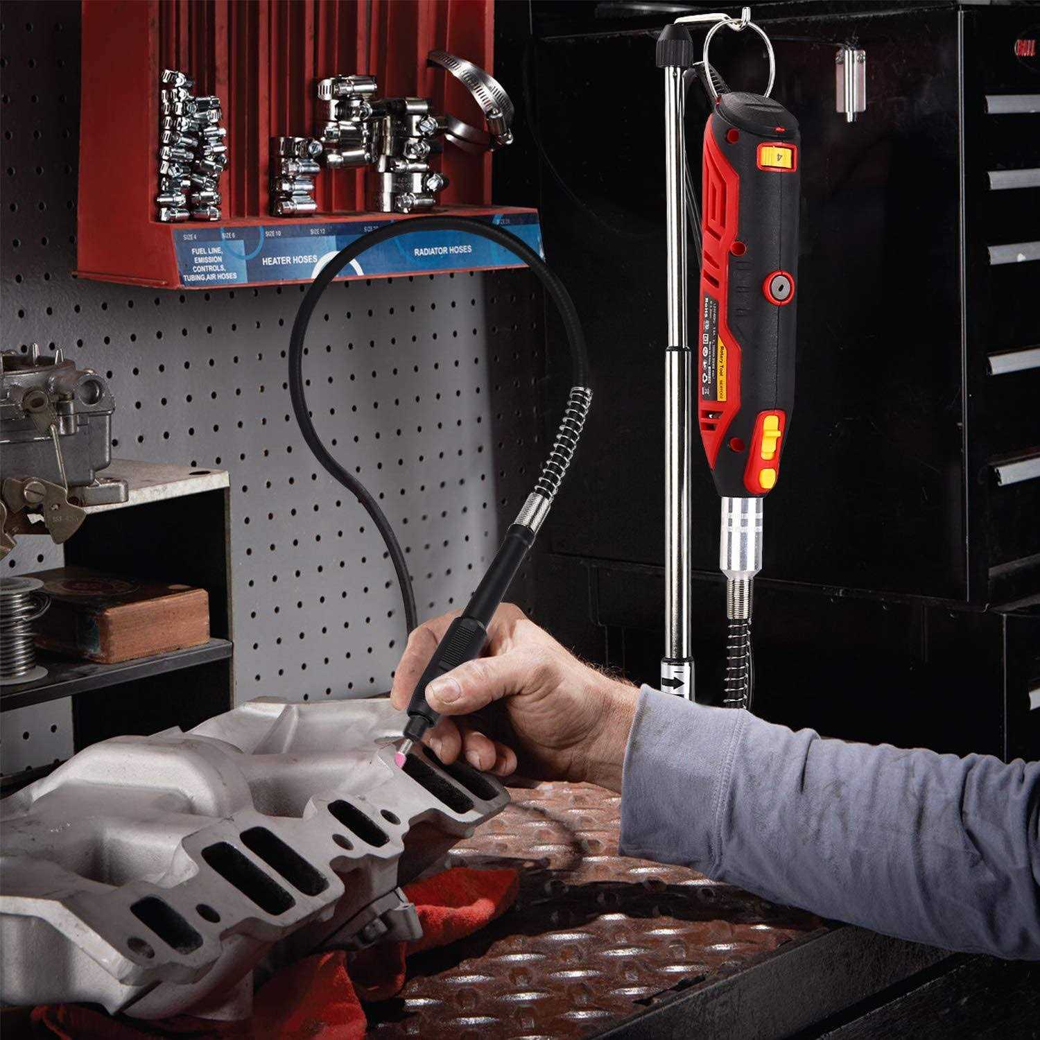 Rotary Tool Kit,Tool with MultiPro Keyless Chuck and Flex Shaft, 6 110 Add-on Support, Wide Application 110 accessories covers numerous application ranging from cutting, etching, boring, fining sand, polishing and even grooming pet dogs’ nails. It allows you to end up the job promptly, save time. 6 Turning with Adjustable Rate: The 135W electric motor gives powerful power for cutting, grinding, engraving, exploration, cleaning/polishing, and so on. You can easily adjust the rotation speed of 35,000 rpm to 10,000 rpm max depending on the material of the job. 4 Attachments Support + Keyless Chuck Flexible shaft for simpler usage in limited rooms; Extendable rotating clamp owner with functional multi-tool holder; Safety cover can assist from debris and sparks throughout reducing, grinding, fining sand applications. The ergonomically designed soft rubber grasp effectively decreases vibration as well as provides you optimum control during operation, making your work much easier. The u
