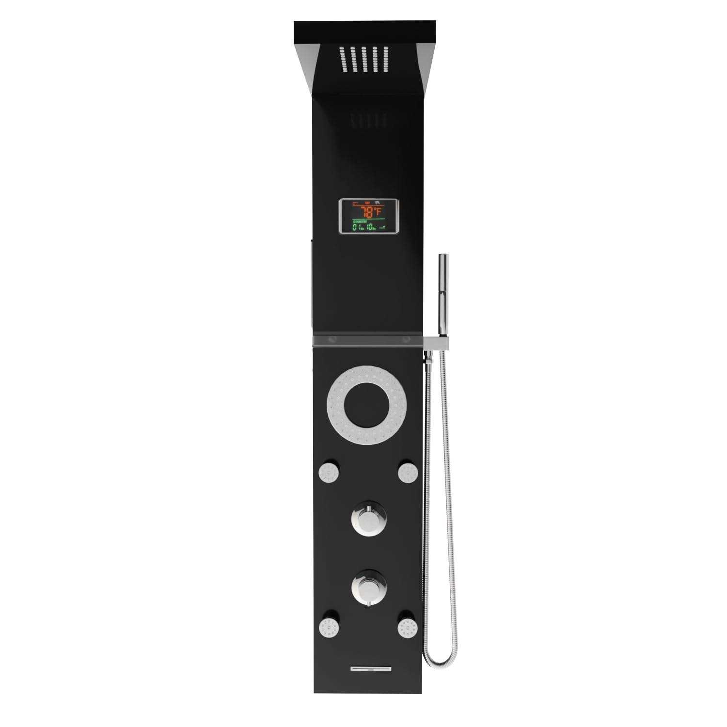 LED Shower Panel Lights: The rain shower head has LED lights, the blue light from the nozzles bring you a more comfortable bathing experience. And there is a temperature display that assist you to select the best water temperature to bath. 5-Function Tower Shower Panel: shower panel features built-in LED temperature display (need five 5V battery), LED rainfall shower head, body jets, tub spout, and 2-function handheld spray, you can combine shower panel functions as you like. Easy Installation: The black shower panel system is wall mounted, requiring just four holes on the wall. Once the shower panel is assembled, it can be directly hang on the wall. All accessories are included in package, installation simple, no need for installation workers, saving installation cost. Shower Panel System Material: The shower panel system is made of durable 304 stainless steel, features corrosion-resistant, High temperature resistance, and longer useful life. The pressure balance valve cartridge monitors water pressure balance to protect you from scald due to sudden changes of pressure of hot or cold water. 5-Function Shower Panel System: shower panel features built-in LED temperature display (need five 5V battery), LED rainfall shower head, body jets, tub spout, and 2-function handheld spray, you can combine shower panel functions as you like.