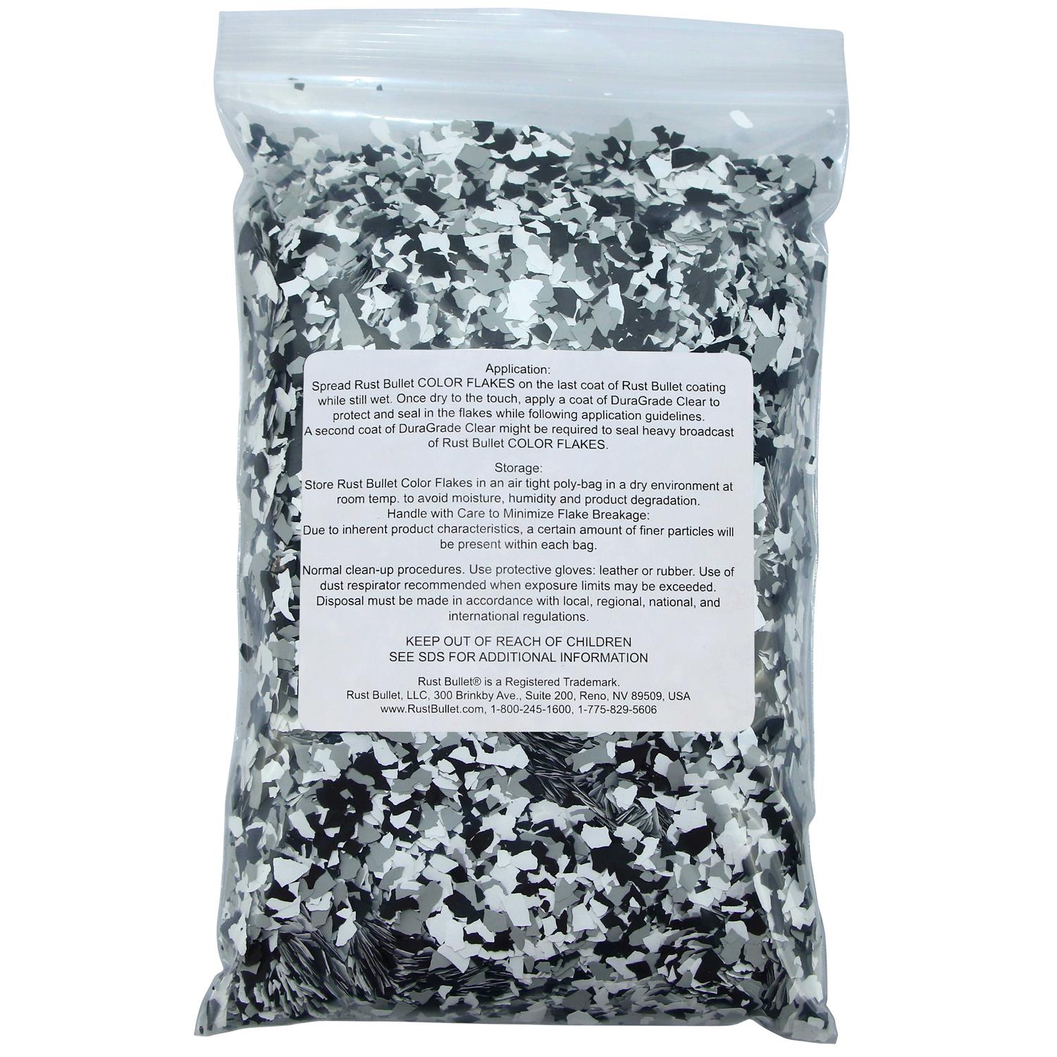 ENHANCE YOUR FLOOR – Enhance your décor by sprucing up your floor! Our colored flake chips for concrete floors take your space to the next level with a perfect finish. Also helps hide dirt and surface imperfections. EASY TO USE – Simply sprinkle on a prepared surface to create a permanent bond and a showroom finish! Use one color or mix and match to blend for a custom look. CONVENIENT SIZE BAGS FOR DESIRED EFFECT – Sold in convenient 1 pound bags. Broadcast Recommendations: Light Broadcast – approx. 1 pound per 250 sq/ft. Medium Broadcast – approx. 2 pounds per 250 sq/ft. Heavy Broadcast – approx. 3 to 4 pounds per 250 sq/ft. MULTIPLE USES – Decorative color flakes are great indoors and outodoors! Use them for your garage, basement, shed, she shed, work room, laundry room, home, patio, warehouse. USA Business – Rust Bullet, LLC was formed February of 2001 in Reno, Nevada, where our Corporate Offices still operate. Rust Bullet Color Flakes are specially formulated paint aggregates used to enhance the aesthetic qualities of Rust Bullet’s Concrete Coatings. This unique product is random in shape, sized within a standardized range and are available in five popular color blends: Midnight Electric Blue Black Marble Desert Sand Autumn Brown Sold in convenient 1 pound bags. Broadcast Recommendations: Light Broadcast – approx. 1 pound per 250 sq/ft Medium Broadcast – approx. 2 pounds per 250 sq/ft Heavy Broadcast – approx. 3 to 4 pounds per 250 sq/ft