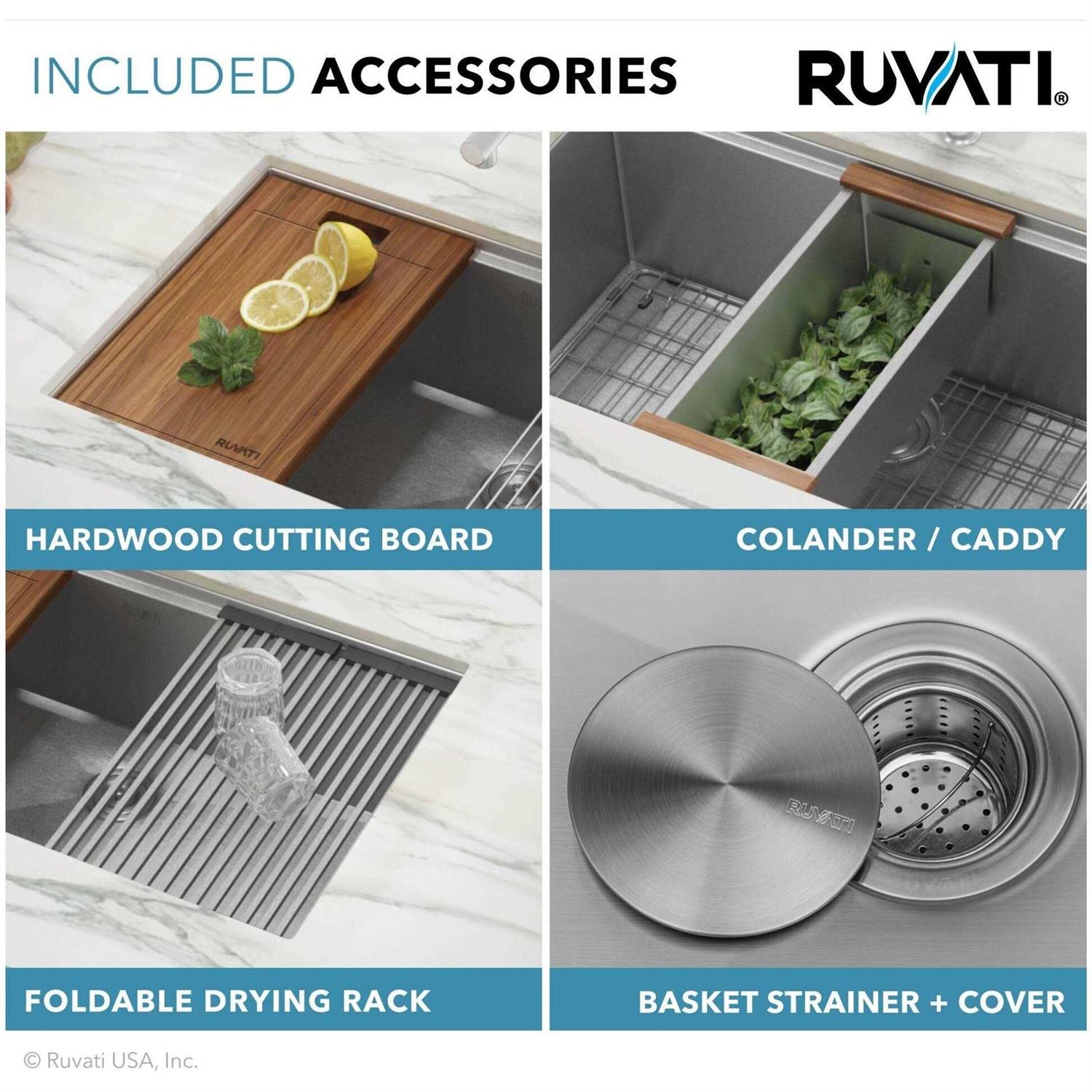 Ruvati This WORKstation sink from Ruvati’s Roma series converts your kitchen sink into a full functional workstation. Built-in accessories (colander, cutting board and folding rack) slide on the integrated tracks in the sink. Includes a deep stainless steel colander that you can use as strainer. The solid hardwood cutting board is constructed of Sapele wood – a luxurious wood that has a beautiful finish and handles water well. The foldable drying rack, made of square stainless bars and silicone, folds out on the track and is ideal as a dish drying rack. Ruvati’s Roma workstation turns your sink into a complete work space – you can do all your prep work right on top of your sink, and keep your countertops clean and free of mess.