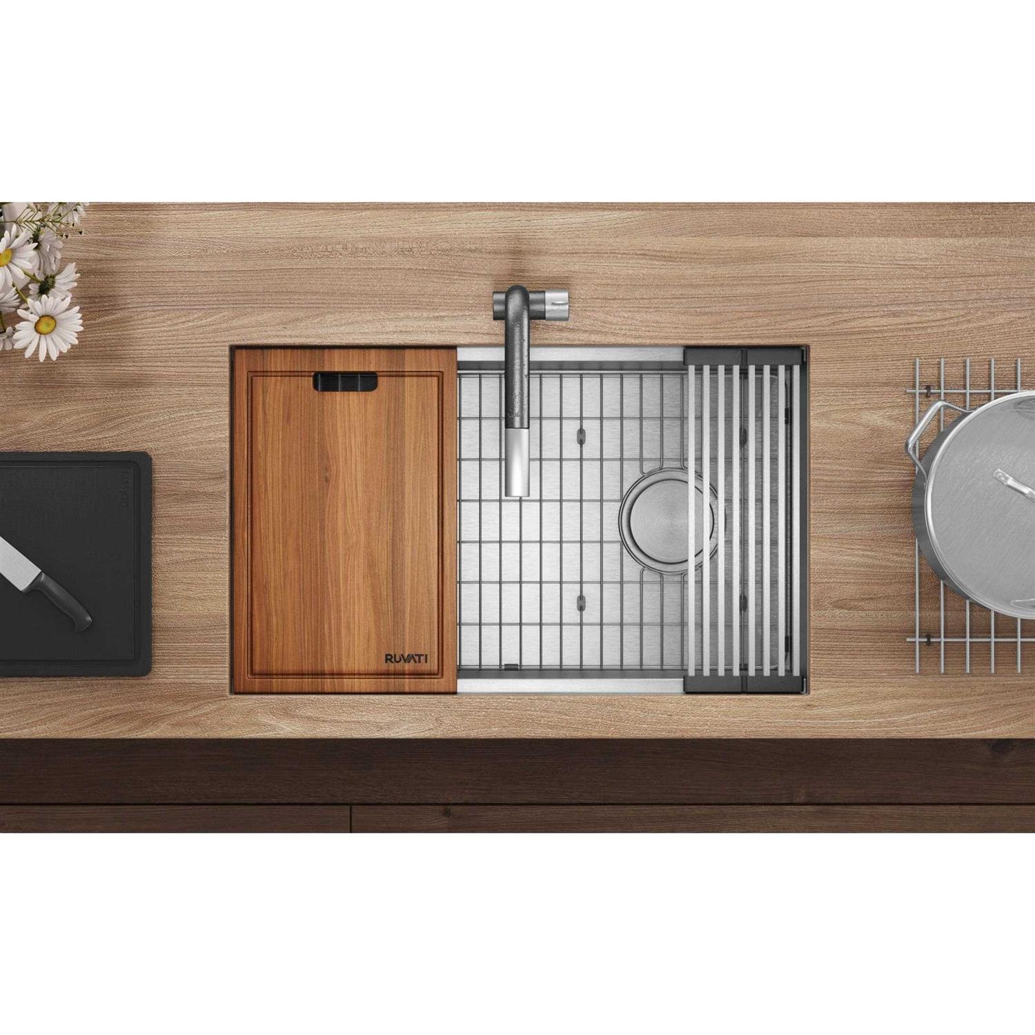 The Veniso series is the newest addition to Ruvati’s formidable collection of workstation sinks. It adds an innovative Sloped Bottom and an Offset Drain to the workstation sink. The WORKstation feature converts your kitchen sink into a full functional workspace by adding built-in accessories (cutting board and folding rack) that slide on the integrated tracks in the sink. The Slope Bottom is an innovative solution for perfect drainage. Unlike other sinks that have a flat bottom, the bottom of this sink has a 2.5% slope. This ensures that water and debris flows freely towards the drain, keeping your sink clean and dry. The drain is located on one side of the sink, giving you more functional space both inside and under the sink. The sink is reversible, so you can install it with the drain on left side or right side. Another important feature of this sink is the rounded bottom corners. The bottom edges and corners of the sink are gently rounded allowing for easy cleaning. The included solid hardwood cutting board is constructed of Sapele wood – a luxurious wood that has a beautiful finish and handles water well. The foldable drying rack, made of square stainless bars and silicone, folds out on the track and is ideal as a dish drying rack.