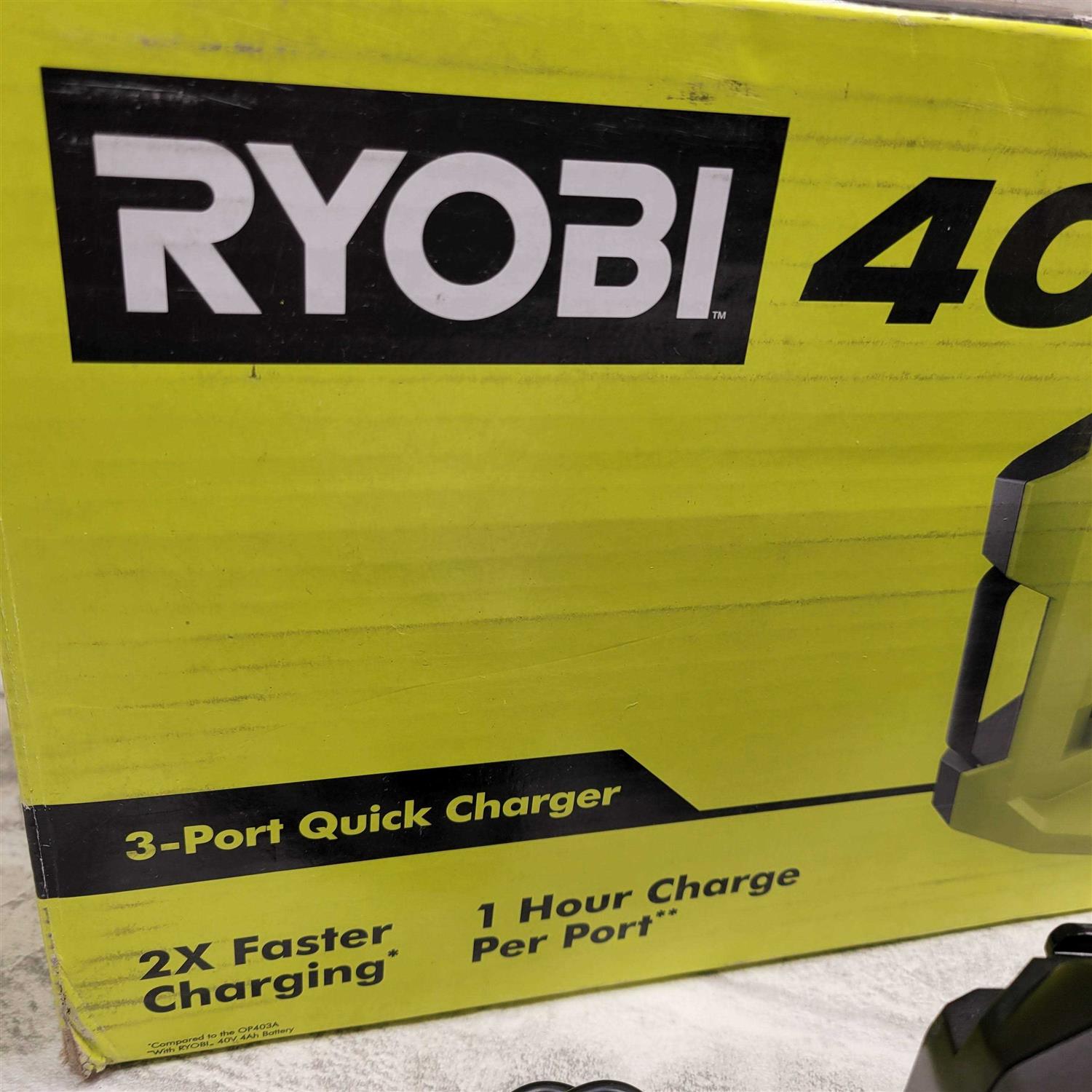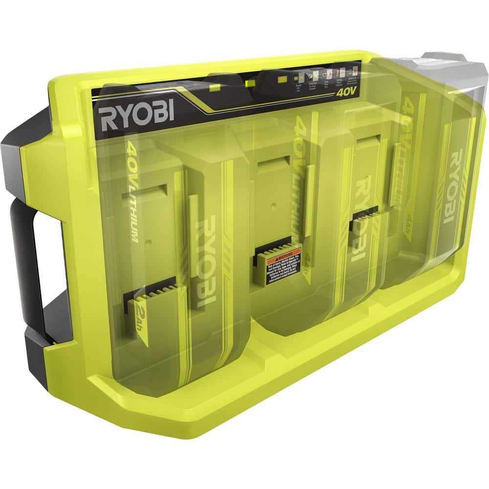 Compatible with All RYOBI 40-Volt Lithium-Ion Batteries Charges One Battery at a Time Batteries Sold Seperately RYOBI introduces the 40-Volt Lithium 3-Port Quick Charger. Compatible with all RYOBI 40-Volt batteries. Sequential charging allows you to have a battery ready when you need 1, while the other batteries are still charging. With 2X faster charging you can spend less time charging batteries and more time getting yard work done. The indicator lights provide the battery charging status and even lets you know if the battery is too hot or too cold to charge. For easy transport, this charger has a handle and removable power cord. You can place the charger on a work bench or mount it on a wall vertically or horizontally to give you extra space. This charger is compatible with all RYOBI 40V batteries.