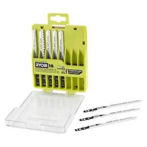 Complement your cutting solutions with the RYOBI 10 PC. These jig saw blades feature a universal shank for a guaranteed fitment with all jig saws. This set contains a wide variety of blades ranging from 6 to 24 TPI for fast, smooth, fine and scroll cuts. This all-inclusive set contains everything you need for tackling common woodworking projects as well as additional plastic and metal cutting. The 10 PC. All Purpose Jig Saw Blade Set is compatible with all jig saws and includes (2) HCS Jig Saw Blades 6 TPI (Fast Cuts), (2) HCS Jig Saw Blades 10 TPI (Smooth Cuts), (1) HCS Jig Saw Blade 14 TPI (Fine Cuts), (2) HCS Jig Saw Blades 14 TPI (Scroll Cuts), (1) BiMetal Jig Saw Blade 10 TPI (Fast Cuts), (1) BiMetal Jig Saw Blade 18 TPI (Smooth Cuts) and (1) BiMetal Jig Saw Blade 24 TPI (Fine Cuts). Complement your tool collection with RYOBI Accessories.