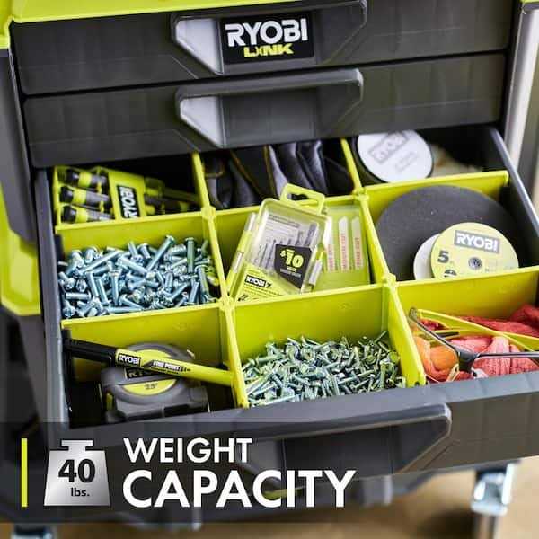 The RYOBI LINK Modular Storage System is revolutionizing the storage industry, enabling you to Organize, Access and Transport your life. The RYOBI LINK 3-Drawer Tool Box is designed to handle the toughest of situations with impact resistant material and a 40 lb. load capacity. Easily secure your items with the stow-away steel lock bar and secure locking point. The full extension slides provide smooth operation while the included Organizer Divider Set provides maximum organization, keeping small parts in their place. The RYOBI LINK Drawer Tool Box Foam Insert gives you the ability to customize your tool box to keep tools firmly in place. Design your Foam Insert in four easy steps. Simply trace your tool, cut outline of tool, pick out foam and place tool in foam insert. For Use with RYOBI LINK STM301 2-Drawer Tool Box and STM302 3-Drawer Tool Box. The RYOBI LINK 3-Drawer Tool Box Dividers gives you the ability to customize your tool box to keep small parts and accessories in place. This set is for use with the RYOBI LINK STM302 3-Drawer Tool Box and includes (2) Long Dividers and (6) Short Dividers. Best of all, it is part of the RYOBI LINK Modular Storage System line of products that use the same locking technology to seamlessly connect your mobile and stationary storage needs. Own your space with RYOBI LINK Modular Storage System. Color: RYOBI Green.