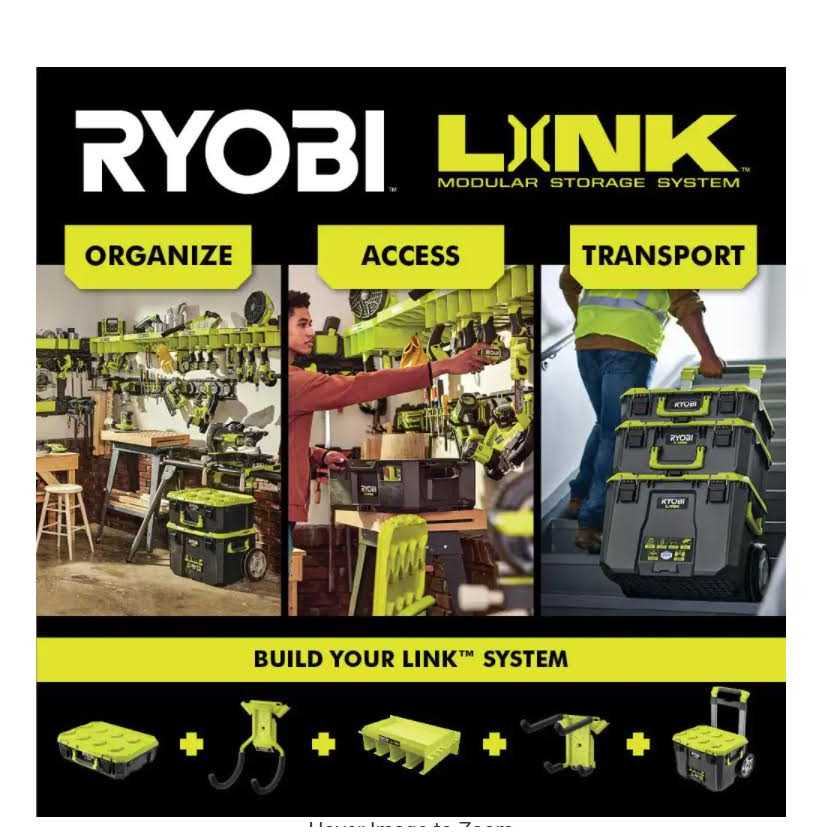 The LINK Modular Storage System is revolutionizing the storage industry, enabling you to Organize, Access and Transport your life. The LINK Rolling Tool Box is designed with impact resistant material to handle the toughest of situations. It has a wide, steel telescoping handle and 9 in. all terrain wheels that support a 200 lb. load capacity. This Rolling Tool Box is IP65 rated to protect your items from water and dust in any environment. The integrated RYOBI accessory bit storage and included Double Organizer Bin provides maximum organization. Easily secure your items with a locking point and integrated tie down anchors. The LINK Medium Tool Box is designed to handle the toughest of situations with impact resistant material and an 80 lb. load capacity. This Medium Tool Box is IP65 rated to protect your items from water and dust in any environment. The LINK Standard Tool box is designed to handle the toughest of situations with impact resistant material and a 50 lb. load capacity. This Standard Tool Box is IP65 rated to protect your items from water and dust in any environment. Best of all, it is part of the LINK Modular Storage System line of products that use the same locking technology to seamlessly connect your mobile and stationary storage needs. Own your space with LINK Modular Storage System.