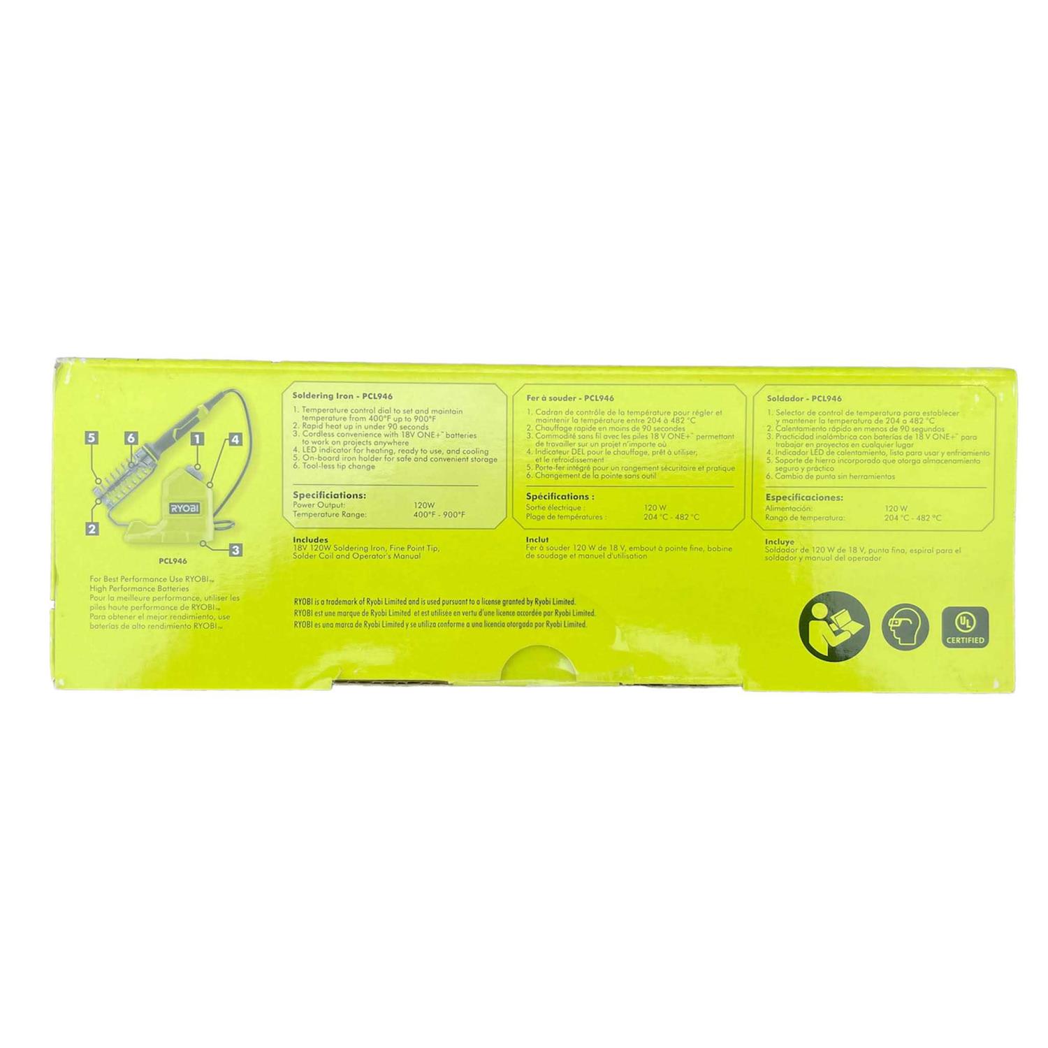 - Includes: (1) PCL946 18V ONE+ Cordless 120-Watt Soldering Iron, (1) fine point tip, (1) solder coil, and operator’s manual