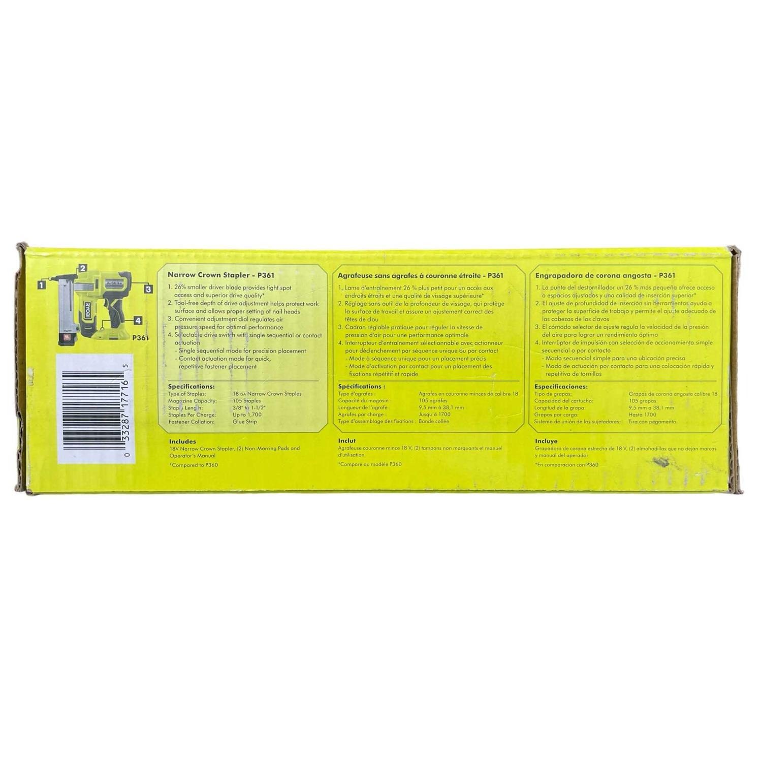 Expand your RYOBI 18V ONE+ System with the 18V ONE+ AirStrike 18GA Narrow Crown Stapler, and enjoy the convenience of AirStrike Technology, eliminating the need for noisy compressors, bulky hoses and expensive gas cartridges. This means faster setup and easy maneuverability on the job site. The RYOBI P361 Narrow Crown Stapler is capable of sinking up to 1-1/2 in. staples in hardwoods. Additionally, it is the lightest cordless narrow crown stapler in its class, helping prevent user fatigue. This stapler allows for extended periods of continuous work by sinking up to 1,700 staples per charge. It also offers a 26% smaller driver blade for superior drive quality, compared to P360. There is a tool-free depth of drive adjustment that allows for proper setting of nail heads. Great for lattice work and floor underlayment, this Crown Stapler is the perfect addition to any carpenter or DIYer’s tool collection. Best of all, it is part of the RYOBI 18V ONE+ System of over 260 Cordless Products that all work on the same battery platform.