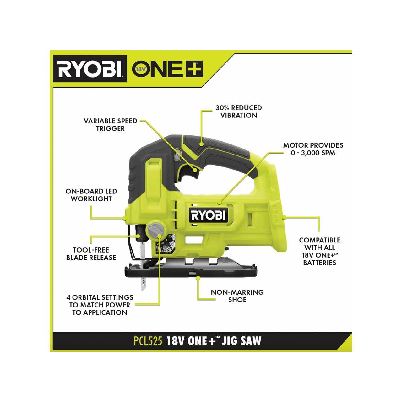Expand your RYOBI 18V ONE+ System with the RYOBI 18V ONE+ Cordless Jig Saw. The variable speed trigger provides fast, precise cuts with up to 3,000 SPM. With 30% less vibration, users will have ultimate cut control and reduced fatigue. Blade changes are quick and easy with tool-free blade release. This jig saw is feature packed with 4 orbital settings, on board LED worklight and non-marring shoe. This 18V ONE+ Cordless Jig Saw accepts and comes with (1) T-Shank wood cutting blade. Best of all, it is part of the RYOBI ONE+ System of over 225 Cordless Tools that all work on the same battery platform. Battery and charger sold separately.