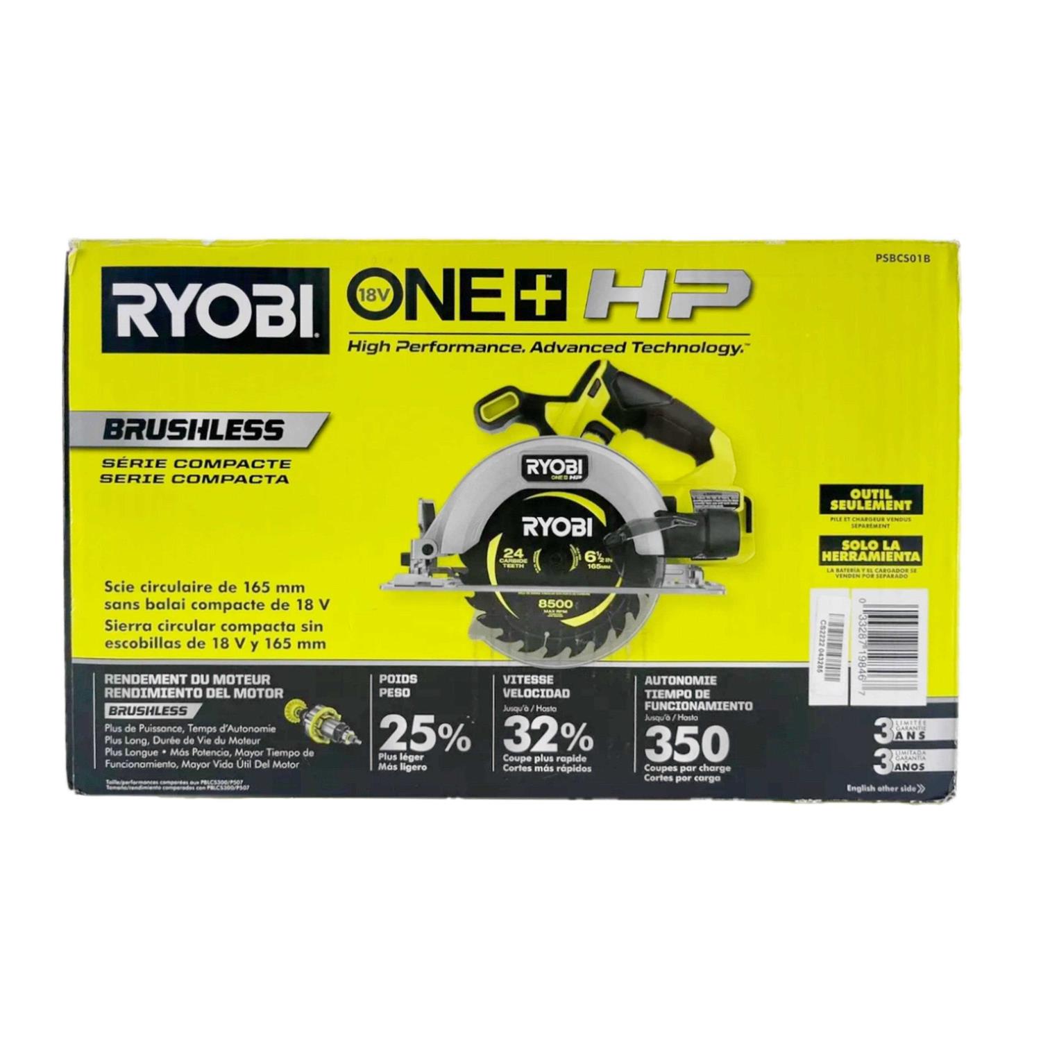 ONE+ HP Technology delivers more power, runtime, durability, and speed utilizing brushless motors, advanced electronics, and HIGH PERFORMANCE lithium technology. Our 6-1/2 in. circular saw is part of the Compact Series and is 25% lighter weight providing portability and easy of use. With 4,900 RPM, this saw provides 32% faster cutting and up to 350 cuts per charge to provide all day power. This compact circular saw offers users the ultimate cut versatility with an adjustable depth gauge that can cut up to 2-1/4 in. deep and can bevel 0 – 50?. Users have ultimate sight line visibility with the on-board LED work light illuminating their cut with ease. Best of all, it is part of the RYOBI ONE+ System of over 260 cordless products that all work on the same battery platform.