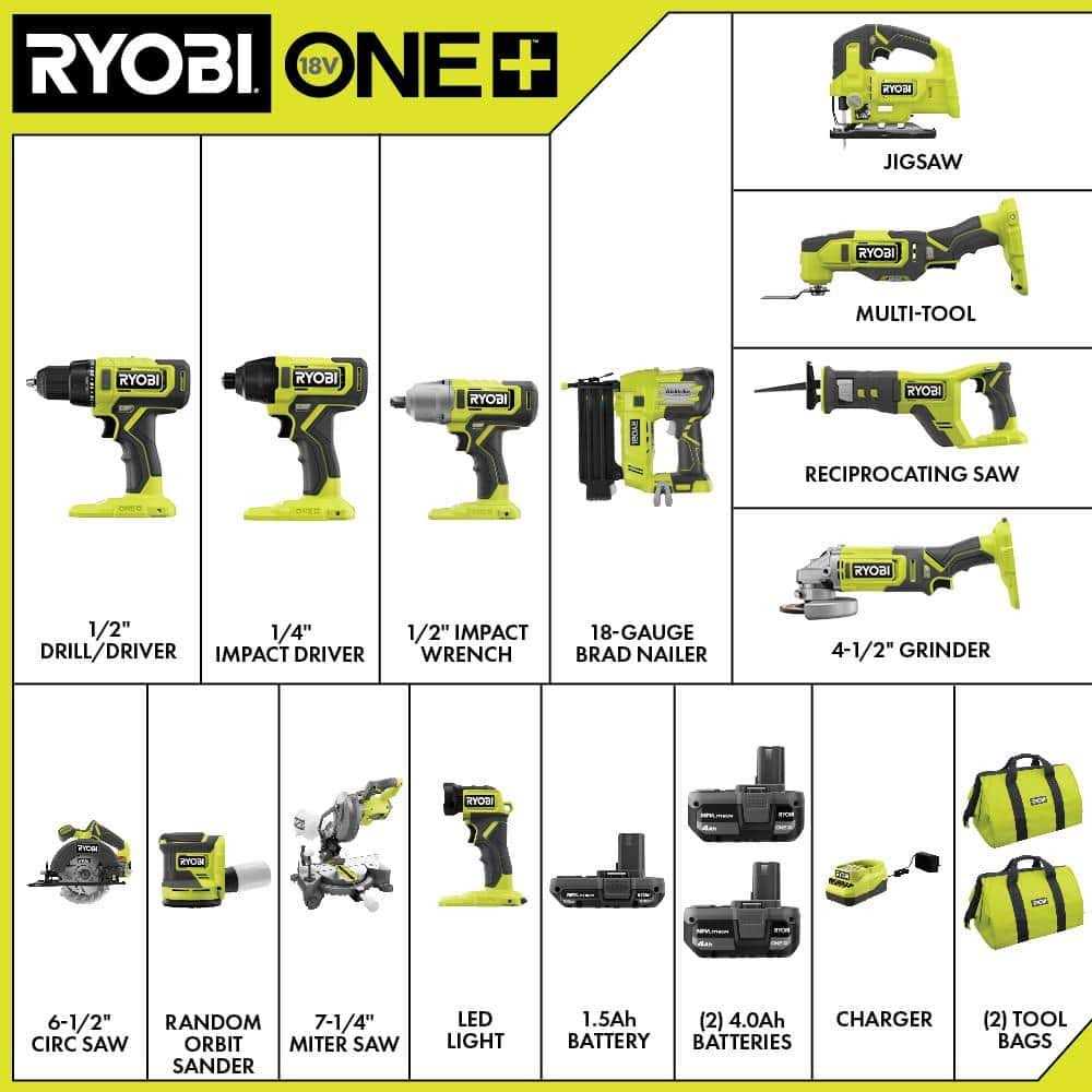 The Drill/Driver has a 1/2 in. heavy duty single sleeve keyless chuck with 24-position clutch to match your drilling and driving needs. The Impact Driver features a variable-speed trigger and 1,800 in./lbs. of torque for control and power when driving long and large screws or bolts. The Reciprocating Saw includes a variable speed trigger to provide more control while cutting a variety of materials. The Circular Saw has front pommel handle for 2-handed operation and a left side blade for better cutline visibility. The Multi-Tool features a lock-on button and variable speed dial for superior ergonomics and reduced fatigue. The Work Light features an ergonomic design and 160 Lumens of light output. The 1.5 Ah and 4.0 Ah Batteries feature lithium-ion cells for longer overall life. The 18-Volt Charger is compatible with all ONE+ Lithium-Ion Batteries. Best of all, this kit is part of the RYOBI ONE+ Worlds Largest 18-Volt Tool System*. The 18-Volt ONE+ 6-Tool Combo Kit includes a drill/driver with screwdriver bit, an impact driver with bit, a reciprocating saw with blade, a circular Saw with blade, a multi-tool with accessories, a work light, 1.5 Ah and a 4.0 Ah battery, an 18-volt charger, a tool bag, and operators manuals.