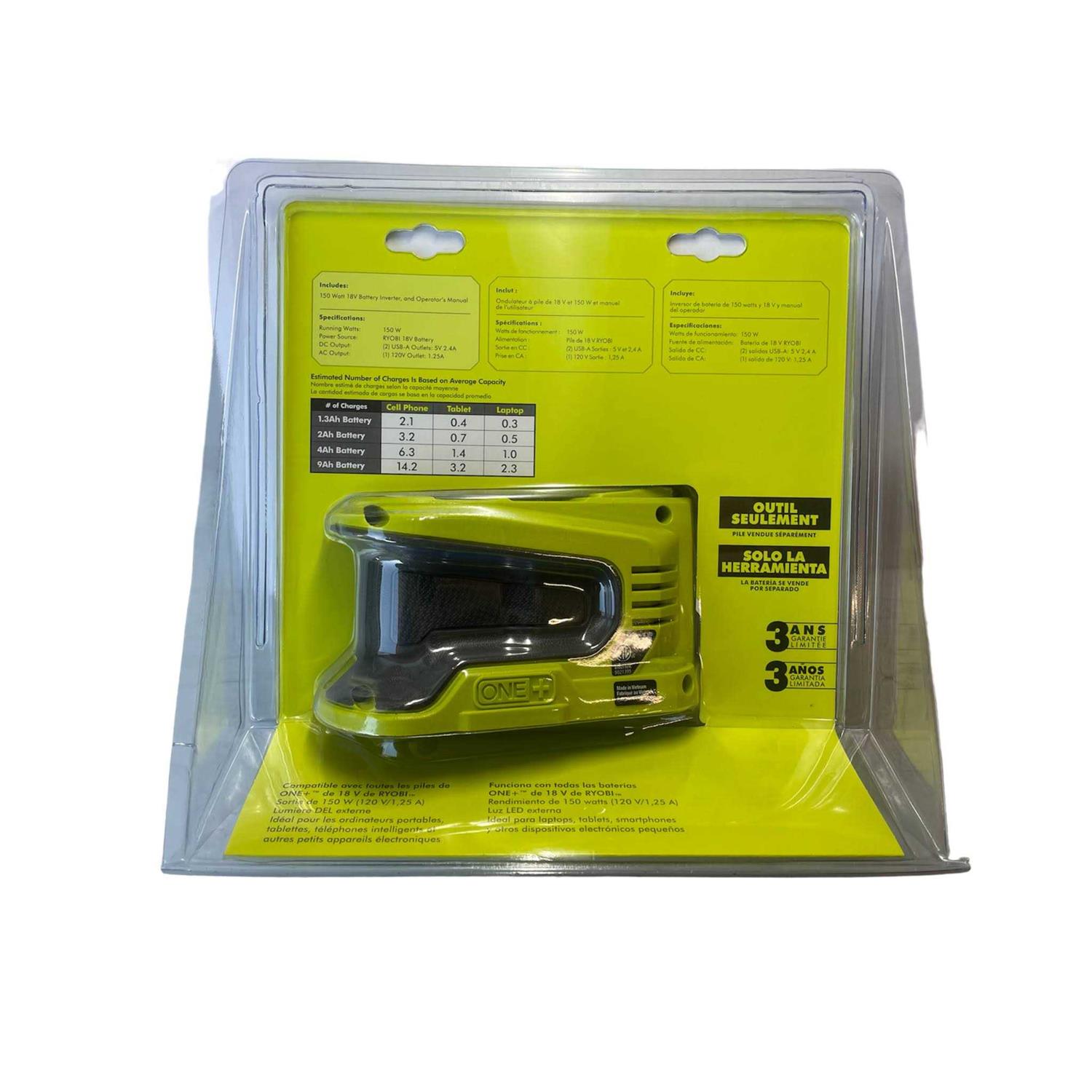 The RYOBI 18V ONE+ Power Source provides convenient, on-the-go power both on and off the jobsite. With a modified sine wave and 150-Watt of continuous output, this inverter is perfect for powering laptops, tablets, cell phones and other small electronics. This compact and lightweight design is compatible with all of your existing RYOBI One+ batteries making endless power even easier. Equipped with 2 USB outlets and one 120-Volt wall outlet for convenient and reliable power.