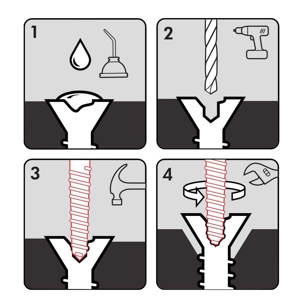 - Simply drill with drill bit, tap in extractor and remove screw or bolt