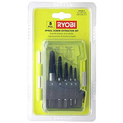 This is the perfect solution for removing screws and bolts. This extractor set features black oxide threads for longer life and performance you can count on, and includes five different sizes for every job. Designed for easily removing screws and bolts Includes 5 common sizes and a chart for assistance Durably crafted from steel with black oxide threads For removing screws and bolts Steel construction Black oxide threads for longer life Simply drill with drill bit, tap in extractor, and remove screw or bolt No more headaches from stripped screws Includes a helpful chart for ease of use Includes: (5) Black Oxide Threaded Steel Screw Extractors in 5/64 in., 7/64 in., 5/32 in., 1/4 in., and 19/64 in. sizes Remove screws and bolts from hard to reach areas with the selection of this RYOBI Spiral Screw Extractor Set. Includes a helpful chart for ease of use.