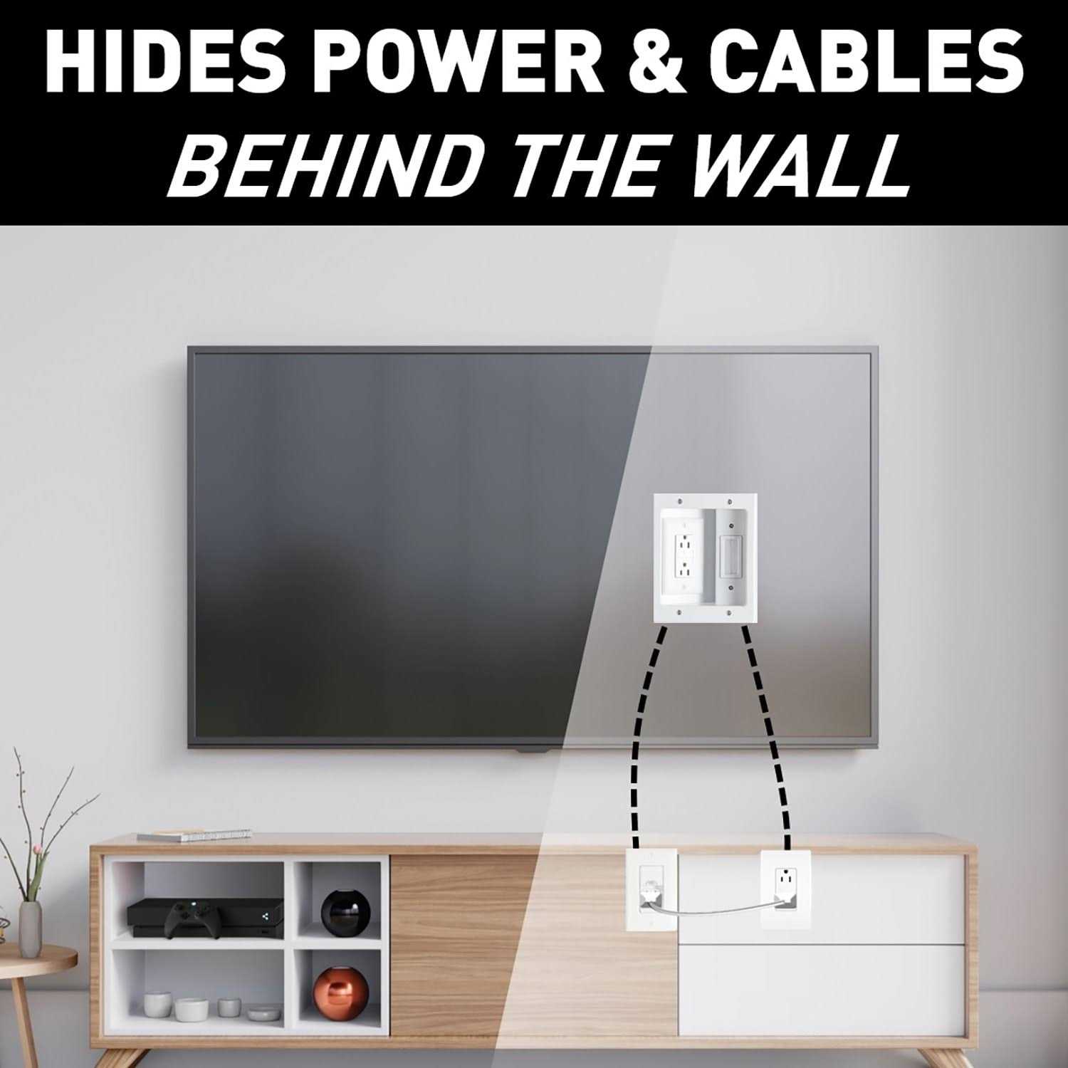 • Extends power to a wall mount TV without modifying the home’s existing wiring