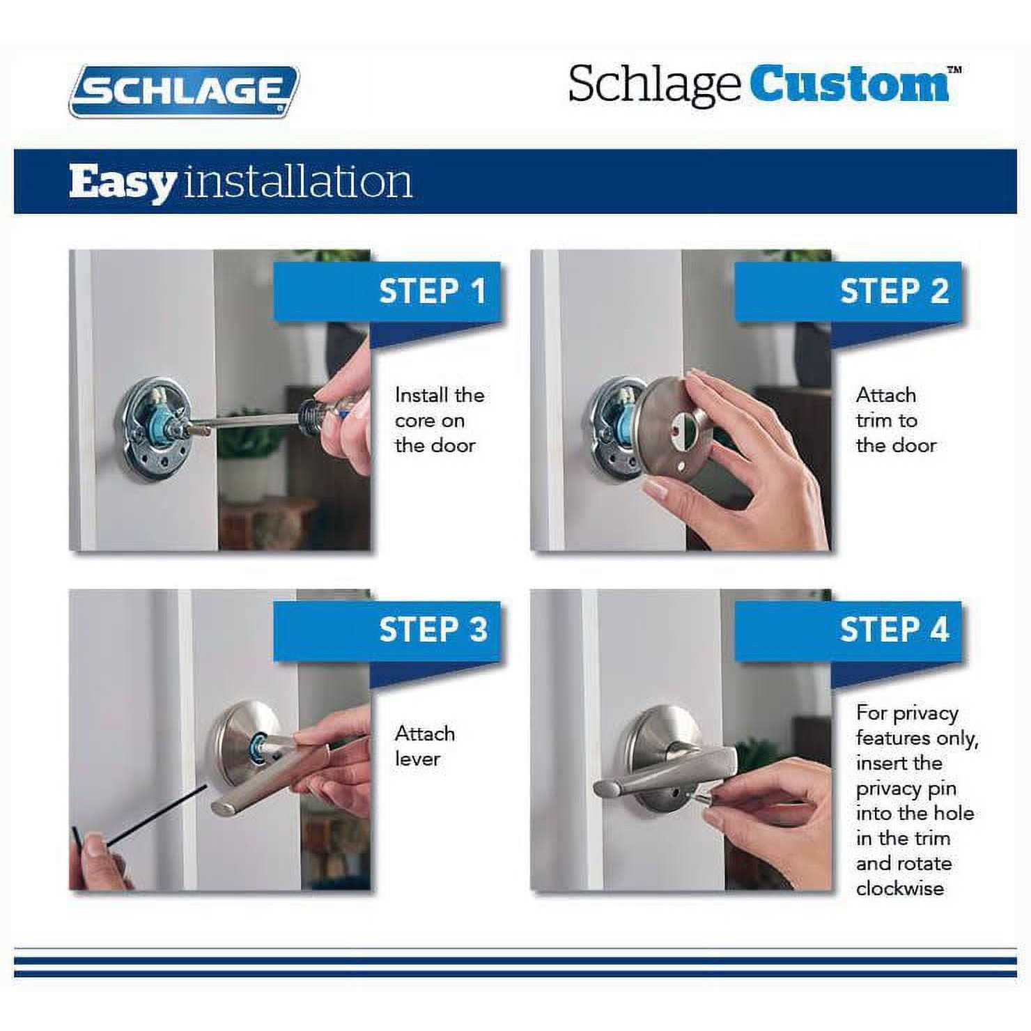 Open your en suite or hallway closet door with this matte black Schlage custom latitude lever. The locking pin supports privacy in a bedroom, bath or dressing room, and the contemporary design blends into your decor. This Schlage custom latitude lever fits standard predrilled doors 1.375 to 1.75 inches thick for versatility and easy installation. Residential latitude lever Designed for both bed-bath and hall-closet doors. Also works with entryway doors when paired with a Schlage electronic deadbolt (sold separately). Matte black finish Fits contemporary and transitional interior styles. Concealed screws with low-profile trim Create a clean and polished look. Compatible with most right- and left-swing doors This handle works with 1 3/8′′ to 1 3/4′′ doors for flexible use. Mounting hardware included Ensures simple installation.